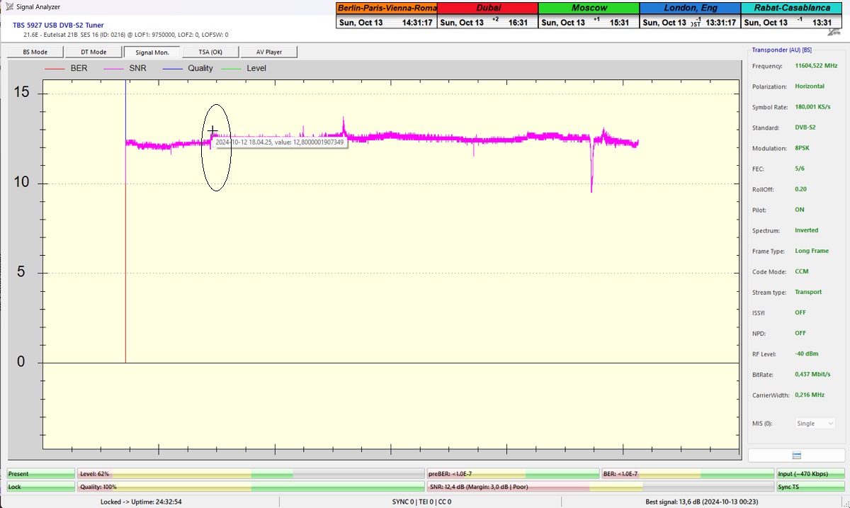 výpadku v kontinuite priebehu Locku v dostatočnej jednotke monitoringu t=72 hodín.Zaznamenal som špičku kvality SNR=13,3 dB a výška signálnej rezervy počas dňa