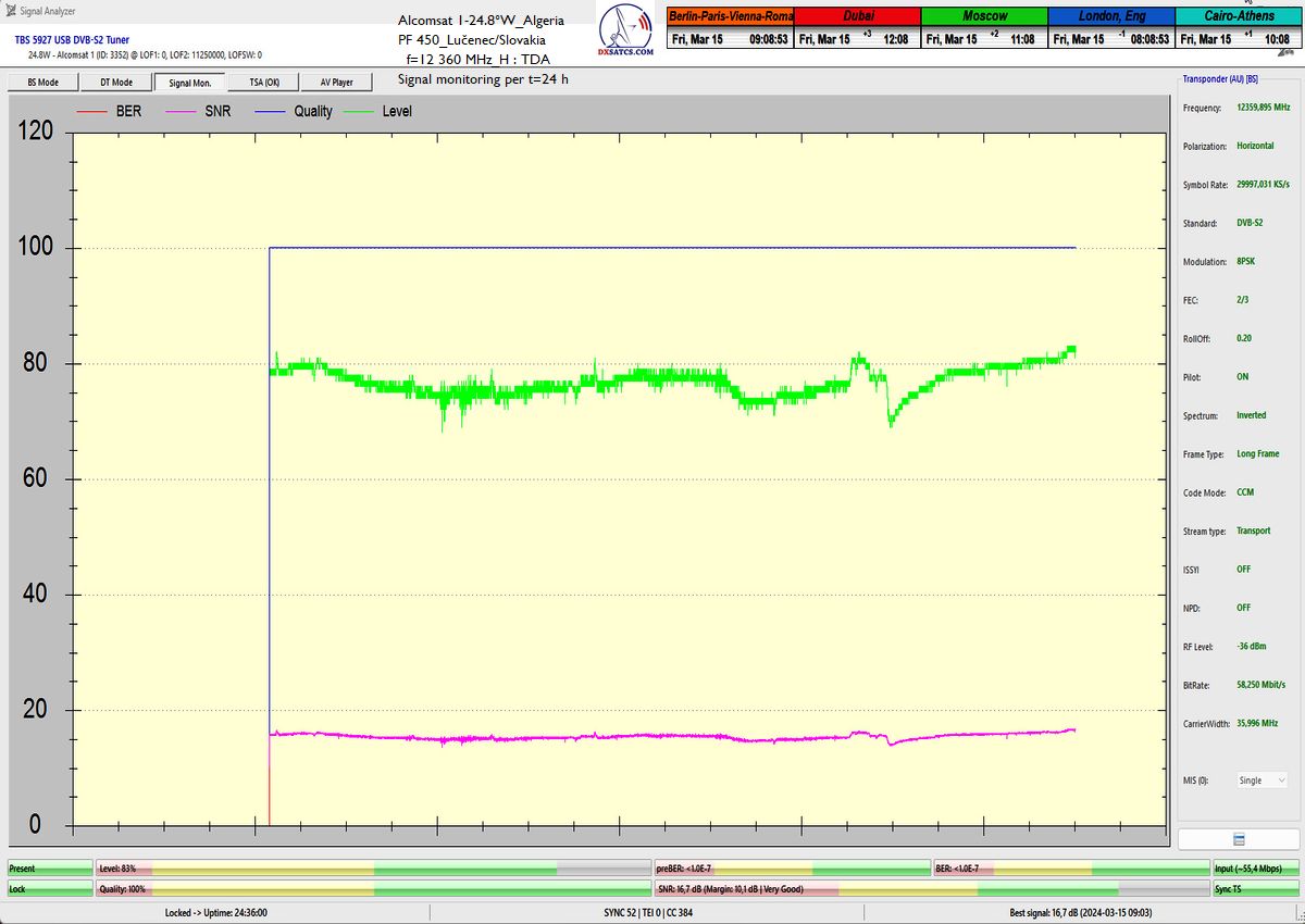 ►De_Klassifizierung der erreichten Ergebnisse bei f=12 360 MHz: Die visualisierte Form des Beweises im Signalmonitoring über eine Einheit von t=72 Stunden,ausgedrückt in Leistungs, Qualitäts und Fehlerverlaufs Trends,demonstriert und beweist gleichzeitig das Erreichen eines vorbildlichen Zustands des Satellitenempfangs,im Sinne eines Zustands,der als MUSTER dienen kann.Die nachgewiesene Empfangsstabilität von 100% mit einem hohen und typischen Qualitätsreserveniveau während des gesamten Tages erreichte Werte von 8 bis 10,4 dB in der Link/Rauschabstand-Messeinheit.Die Kontinuität aller überwachten Einheitstrends wurde durch zwei Wellen von Regenschauern mit relativ hoher Niederschlagsintensität am 16.März 2024 verifiziert.Die täglichen Qualitätspeaks erreichten Werte von 16,7 bis 17,0 dB in der SNR-Einheit und traten in zwei Intervallen auf: von 02:15 bis 02:45 nachts und von 8:45 bis 9:45 morgens.Auch im Fall der Überwachung der Frequenz f=12 360 MHz wurde die endgültige Form der Überwachung bereits beim ersten Versuch erreicht,ähnlich wie dies bei allen anderen Trägern des Satelliten Alcomsat 1 der Fall war.