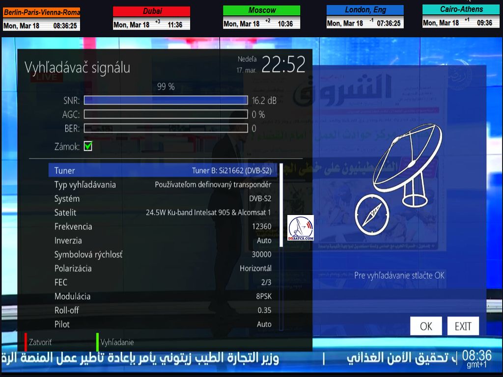 Roman Dávid from Lučenec is the first in Europe who indisputably achieved a stable reception of 100% without a single interruption in Lock continuityon each of the frequencies of the Algerian operator TDA's satellite Alcomsat 1 at 24.8°W within the geographical zone of Central Europe. The author also established the world's first scientific and research center focused on satellite reception technology in "Out of footprint" zones