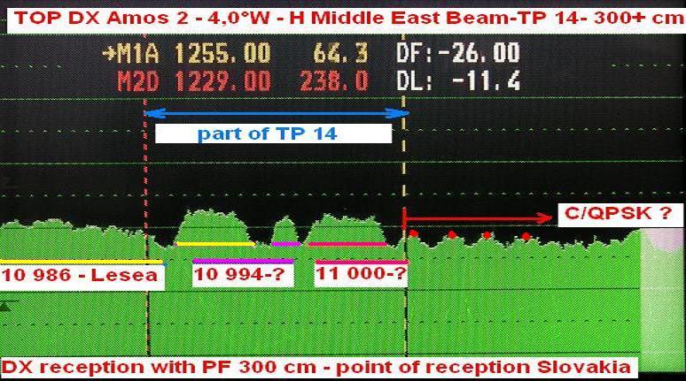 DXSATCS : AMOS 2 at 4,0°W MIDDLE EAST BEAM TP 14 H pol and unknown QPSK carrier in f=10 994 MHz and 11 000 MHz with measurement CN=Error - check analysis ...............DXSATCS AKO JEDINÝ WEB V CENTRÁLNEJ Európskej zóne prezentuje aktuálny signálny stav príjmu DX prevádzača TP 14 vo vyžarovacom zväzku Blízky východ družice AMOS 2 na 4,0°západne