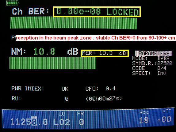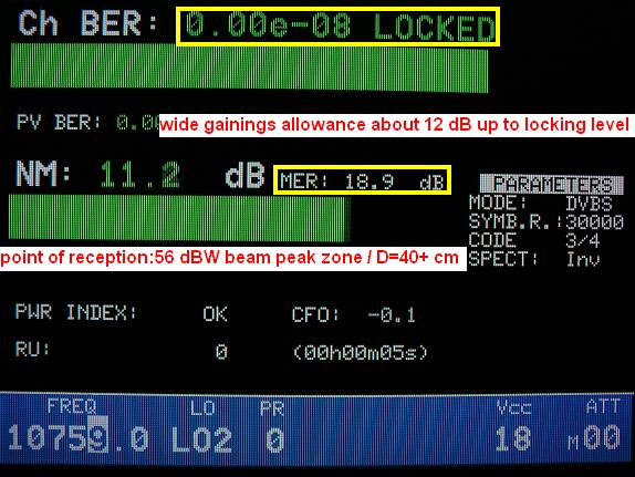- umiestnenie RX zostavy v centrálnej zóne špičky EIRP toku s vyžiarenou úrovňou okolo 54-56 dBW umožňuje v kvalitatívnom vyjadrení jednotky Modulačná Chyba MER na príjmacej strane dosiahnúť výnimočné akostné rozpätia zisku od MER=18-24 dB pri FEC 3/4 čo je čistá hladina ziskového rastu od 12-18 dB nad pásmom uzamknutia QPSK nosnej pri MER=6 dB, pričom konkrétne v tomto prípade pri elevačnom uhle zostavy okolo 30° , čo následne súvisí s výsledným pomerom zisku k šumovej teplote G/T pri jednotlivých častiach RX signálneho reťazca ako anténneho reflektora , LNB atď. , je možné totálnu chybovú nulu BER na kanál=E-08 pred Vitterbi dekodérom resp.stanovenú energiu na bit dosiahnúť už pri MER=14+ dB a FEC 3/4 , čo by pri teoretickom predpoklade rovnakých hladín EIRP tokov z pozícií 4,0°W a 95,0°E v mieste príjmu Lučenec / so zanedbaním permanentného oscilačného rozkmitu amplitúdy Q-kvality vplyvom takmer nulového elevačného uhla / , v praxi znamenalo nemožnosť dosiahnutia porovnatelných kvalitatívnych výsledkov okamitej chybovosti BER na kanál a kvality MER prenosu s rovnakým RX signálnym reťazcom s PF 365 cm .