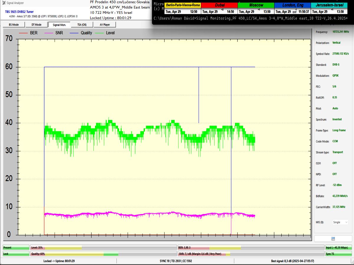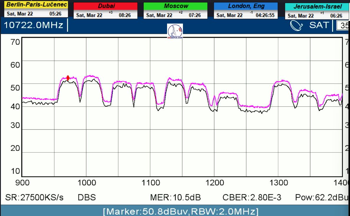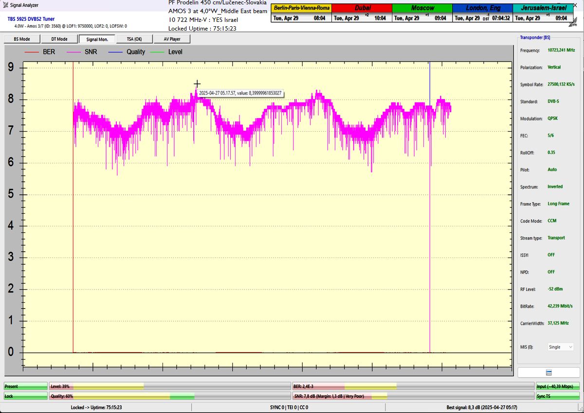 ►►Amos 3 at 4.0°W-Middle East-10 722 MHz-V_YES Israel : Analysis of signal monitoring over a duration of t=80 hours