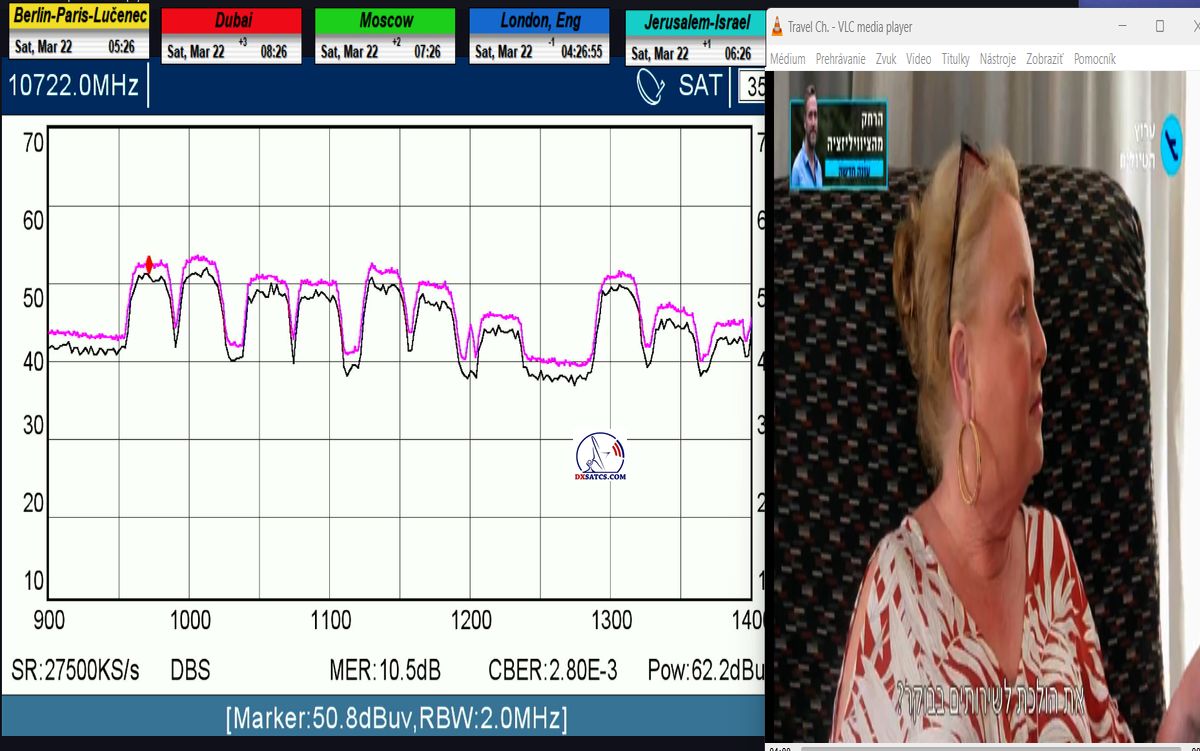 ►SK_na obrazovke môjho PC som sústredil v režime online analýzu spektra a kvality na výstupe z analyzátora Metek HD spolu s online dekódovaným streamom TV Travel Channel na SIDe=1317 v tv pakete YES Izrael vysielaného z f=10 722 MHz v systéme podmieneného prístupu NDS Videoguard