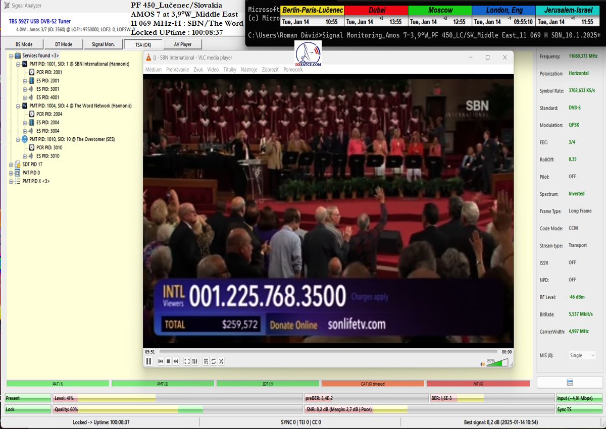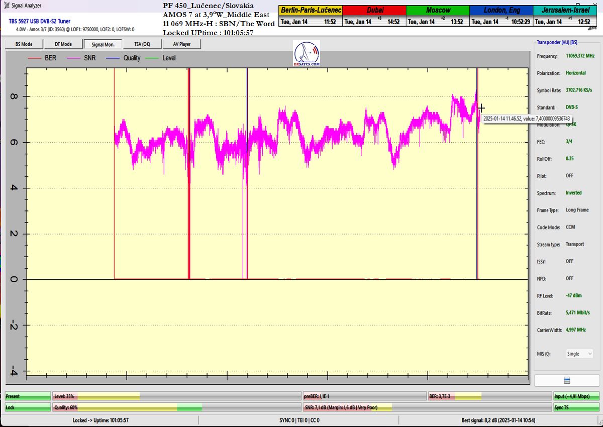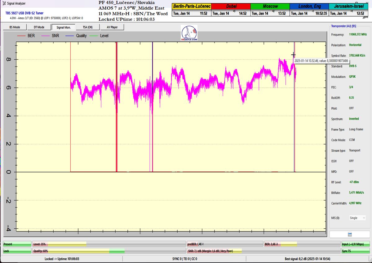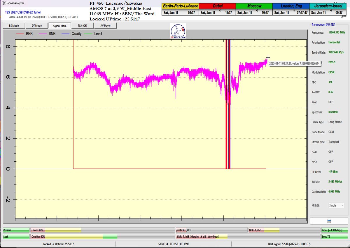►EN_From the perspective of achieving long-term signal stability on the SBN/The Word Network carrier, this represents the waveform with the highest channel bit error rate (ChBER) under Central European satellite reception conditions. In other words, it is one of the most technically complex satellite receptions overall. Despite snow showers at the reception site in Lučenec, I achieved signal stability exceeding 99% on f = 11,069 MHz-H within the verification unit t = 100+ h.
