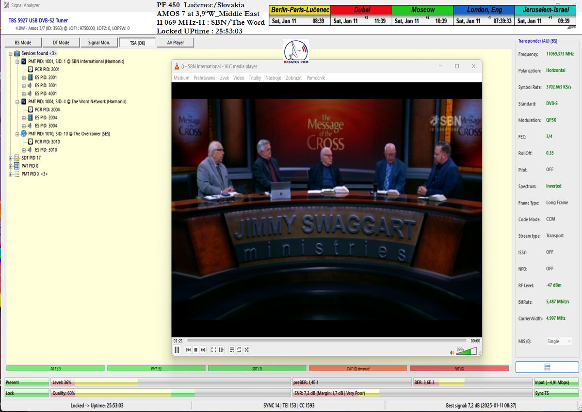 In the verification and signal monitoring period of t=101 hours, I achieved an overall reception stability of 99.40594%, expressed in percentage terms. In other words, I achieved full reception stability of SBN/The Word without a single pixelation or lock drop for a duration of 100 hours and 24 minutes out of the total 101-hour monitoring period.