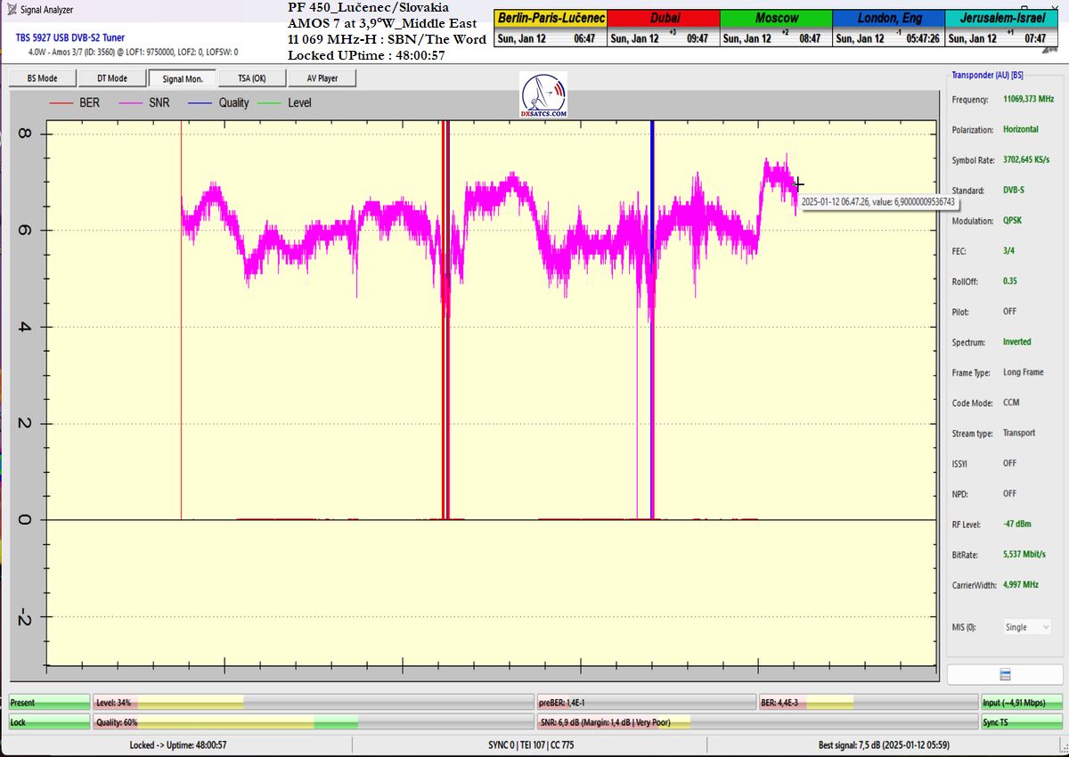 ►DE_Aus der Sicht der Erreichung einer langfristigen Signalstabilität auf dem Träger SBN/The Word Network handelt es sich um die Wellenform mit der höchsten Kanalfelderrate (ChBER) unter mitteleuropäischen Satellitenempfangsbedingungen. Anders ausgedrückt, es handelt sich um einen der technisch anspruchsvollsten Satellitenempfänge überhaupt. Trotz Schneeschauern am Empfangsort in Lučenec erreichte ich auf f = 11,069 MHz-H eine Signalstabilität von über 99 % in der Nachweiseinheit t = 100+ h.