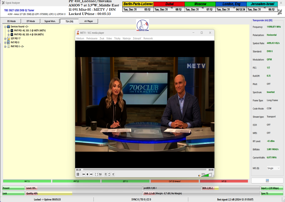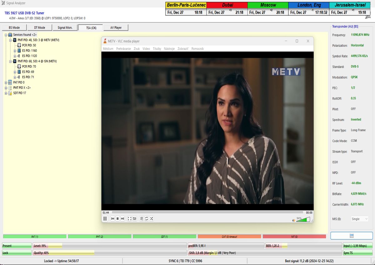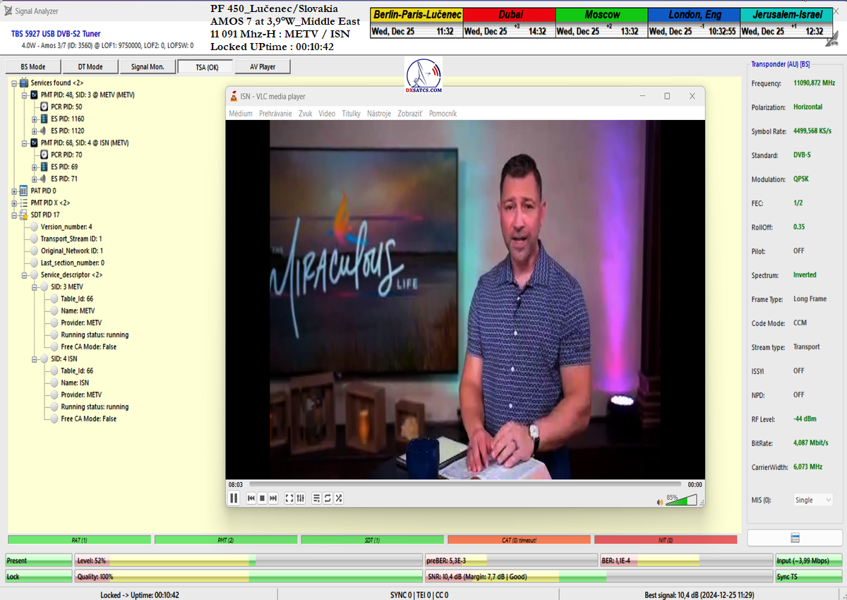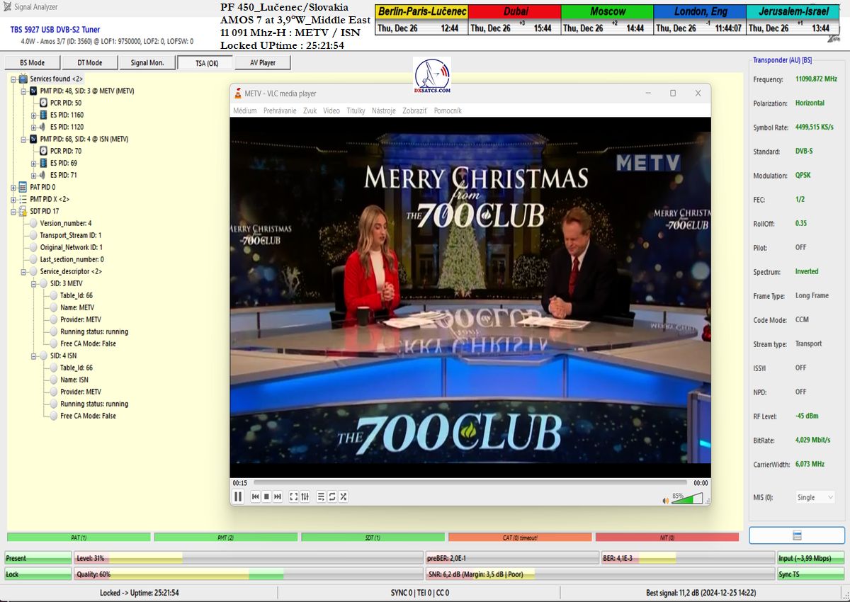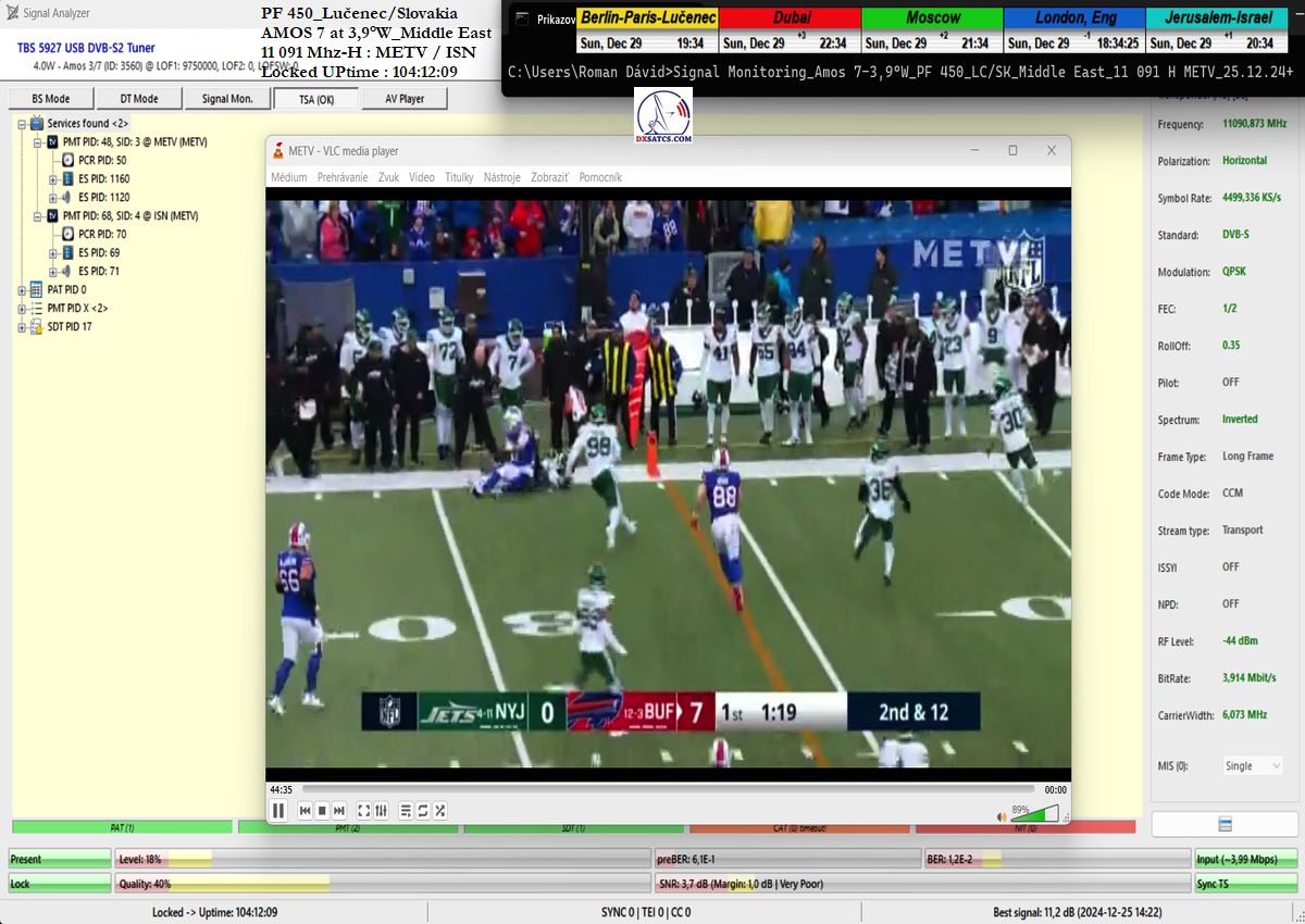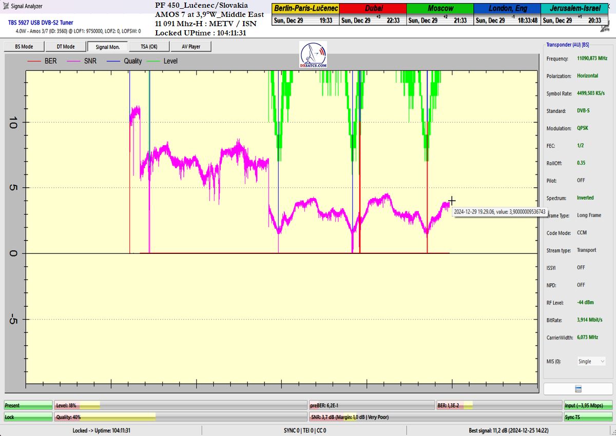 som nemohol ani len začať. Po niekoľkých hodinách výskumov som musel pochopiť a zároveň akceptovať že táto chyba spojená s permanentným rastom okamžitej chybovosti ChBER ja na mojej strane a nejako nesúvisí s ultra nízkou hladinou v intenzite výkonu vlnenia v H polarizácii na f=11 091 MHz v diagrame Middle East družice Amos 7 na 3,9°W. K tomuto presvedčeniu som dospel po hĺbkovej analýze,pretože som nechápal ako je možné že stabilný príjem nebol možný ani pri výške signálnej rezervy okolo 3 dB.Potom čo som v doobedňajších hodinách dňa 25.12.2024 našiel príčinu,zdroj rušenia a hlavne harmonickú zložku signálu,ktorá sa superponovala vo frekvenčnom spektre analyzovanej nosnej sa okamžite hladina signálneho poľa vo vlnovode stabilizovala a od tohto momentu sa datuje že aj pri ultra nízkej výške kvality okolo SNR=1,8-2,5 dB dosahujem plne stabilný príjem bez akýchkoľvek výpadkov v Locku (alebo Pixelácie),čo je v kontexte použitého programu EBSPro už záporná výška signálnej rezervy z dôvodu aplikovanej konfigurácie modulačných parametrov DVB-S/QPSK/FEC=1/2 pri výške minimálneho odstupu C/N pre Lock vo výške len CN=2,7 dB.Keby sa mi nepodarilo identifikovať a odstrániť príčiny spojené s rušením analyzovanej nosnej vo frekvenčnom spektre,ktoré boli jednoznačne na mojej strane a nijako nesúvisely so signálnymi podmienkami spojenými s príjmom v zóne "Out of footprit",alebo Mimo stopy, potom by som nemal dnes čo publikovať a chybne by som kategorizoval tento príjem označením "Čakanie na náhodu,alebo špičku výkonu-Sat DX".Do desiatich minút potom ako som vymenil chybný komponent v signálnom reťazci a hladina signálneho poľa sa stabilizovala a prestala cyklicky a vo vysokej amplitúde oscilovať a potom čo som na anténnom systéme,pomocou digitálneho uhlomera nastavil hodnotu EL=29,69°, signálna kvalita skokovo dosiahla priam giganticky vysokej úrovne okolo SNR=10-11,2 dB,ktorú som doteraz nikdy nezaznamenal,čo je reálna výška rezervy okolo 7-8 dB,ktorá umožňuje nestabilnú formu Locku už na minimálnych priemeroch reflektorov od d=180 do 220 cm.