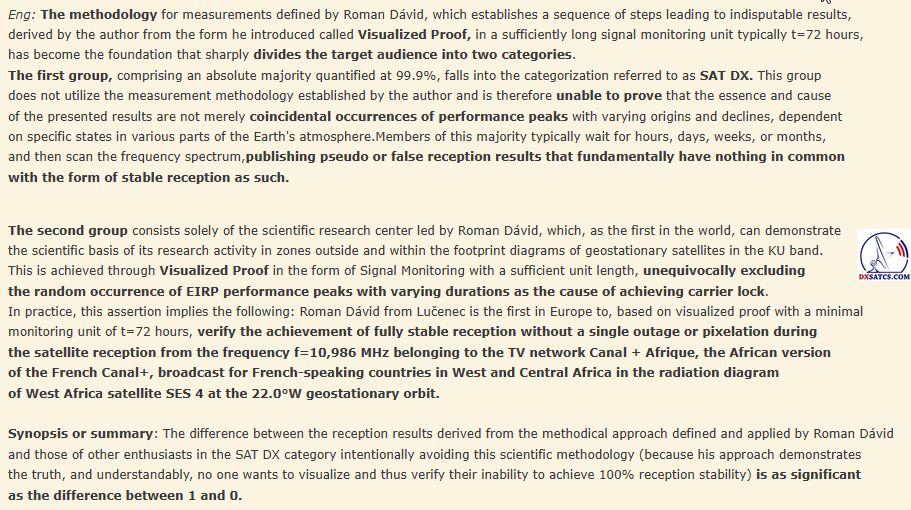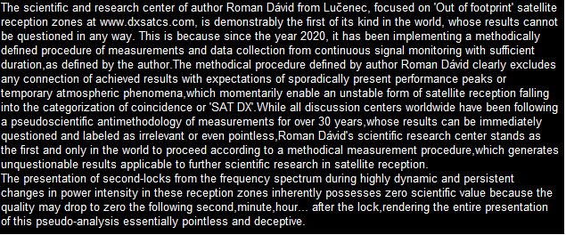 The scientific and research center of author Roman Dávid from Lučenec, focused on 'Out of footprint' satellite reception zones at www.dxsatcs.com is demonstrably the first of its kind in the world, whose results cannot be questioned in any way. This is because since the year 2020, it has been implementing a methodically defined procedure of measurements and data collection from continuous signal monitoring with sufficient duration,as defined by the author.The methodical procedure defined by author Roman Dávid clearly excludes any connection of achieved results with expectations of sporadically present performance peaks or temporary atmospheric phenomena,which momentarily enable an unstable form of satellite reception falling into the categorization of coincidence or 'SAT DX'.While all discussion centers worldwide have been following a pseudoscientific antimethodology of measurements for over 30 years,whose results can be immediately questioned and labeled as irrelevant or even pointless, Roman Dávid's scientific research center stands as the first and only in the world to proceed according to a methodical measurement procedure, which generates unquestionable results applicable to further scientific research in satellite reception.The presentation of second-locks from the frequency spectrum during highly dynamic and persistent changes in power intensity in these reception zones inherently possesses zero scientific value because the quality may drop to zero the following second,minute,hour... after the lock,rendering the entire presentation of this pseudo-analysis essentially pointless and deceptive.