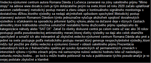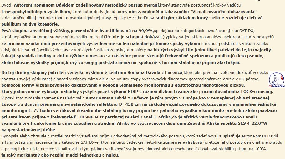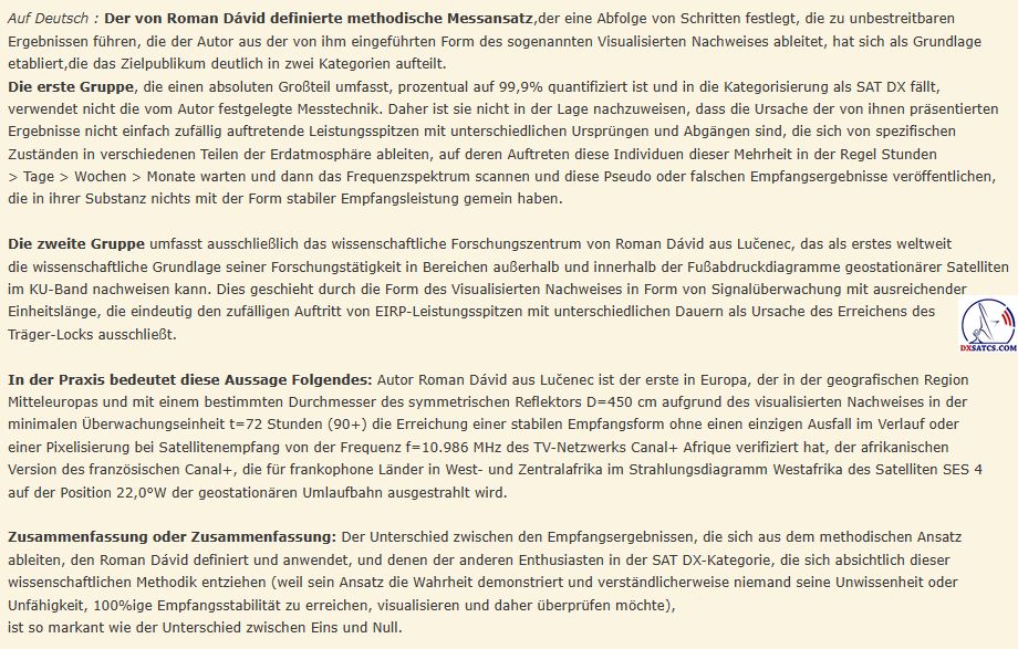 Das wissenschaftliche und Forschungszentrum des Autors Roman Dávid aus Lučenec, das sich auf 'Out of footprint' Satellitenempfangszonen auf www.dxsatcs.com konzentriert,ist nachweislich das erste seiner Art weltweit,dessen Ergebnisse in keiner Weise angezweifelt werden können. Dies liegt daran, dass es seit dem Jahr 2020 ein methodisch definiertes Verfahren zur Messung und Datensammlung aus kontinuierlicher Signalüberwachung mit ausreichender Dauer implementiert hat,wie vom Autor definiert.Das methodische Verfahren,das vom Autor Roman Dávid definiert wurde,schließt klar jede Verbindung der erzielten Ergebnisse mit Erwartungen an sporadisch auftretende Leistungsspitzen oder temporäre atmosphärische Phänomene aus,die vorübergehend eine instabile Form des Satellitenempfangs ermöglichen,die in die Kategorisierung von Zufall oder 'SAT DX' fällt.Während alle Diskussionszentren weltweit bereits seit über 30 Jahren einer pseudowissenschaftlichen Antimethodik der Messungen folgen,deren Ergebnisse sofort als Ganzes in Frage gestellt und als irrelevant oder sogar überflüssig bezeichnet werden können, handelt das wissenschaftliche Forschungszentrum von Roman Dávid als erstes und einziges auf der Welt nach einem methodischen Messverfahren, das unbestreitbare Ergebnisse liefert,die für weitere wissenschaftliche und Forschungstätigkeiten im Bereich des Satellitenempfangs verwendet werden können.Die Darstellung der Trägerverriegelung im Frequenzspektrum während dynamischer und dauerhafter Änderungen in der Leistungsintensität in diesen Empfangszonen hat selbstverständlich keinerlei wissenschaftlichen Wert,da die Qualität bereits die nächsten Sekunde,Minute,Stunde ... nach der Trägerverriegelung auf null sinken kann,was die gesamte Präsentation dieser Pseudoanalyse im Wesentlichen nutzlos und betrügerisch macht.
