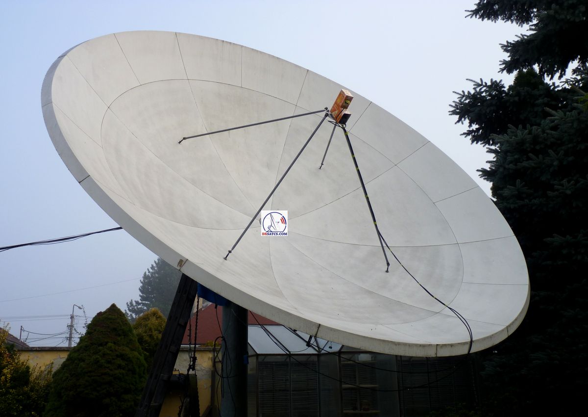 ►Reflector PF Prodelin 450 cm > Primary feed horn positioned in a manual SKEW rotation mechanism > OMT orthomode transducer, model ESA-1212-X/1 >SMW_Q-PLL type R LNB with LOF stability +/- 25 kHz, SMW_Q-PLL type O LNB with LOF stability +/- 10 kHz, and SMW PLL LNB 9.75 GHz with LOF stability +/- 10 kHz +self-made cardboard cover from a non-alcoholic beverage package by the Swiss company SIG-Combibloc, onto which I applied a waterproof, weather-resistant film.