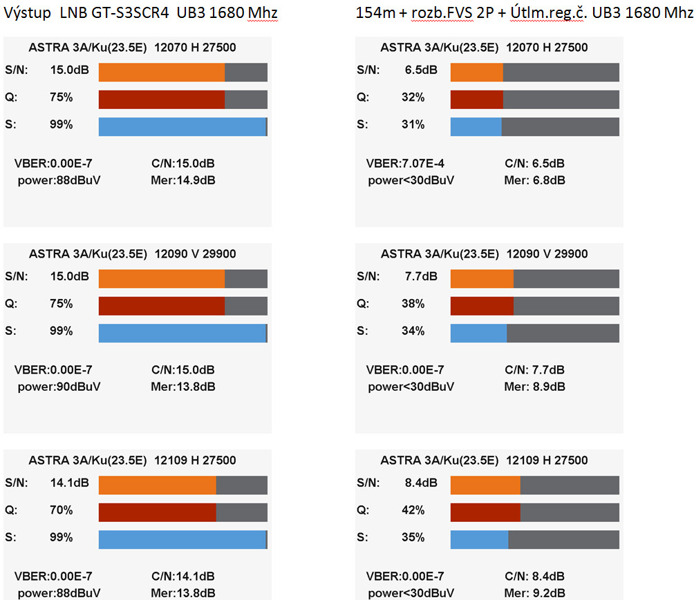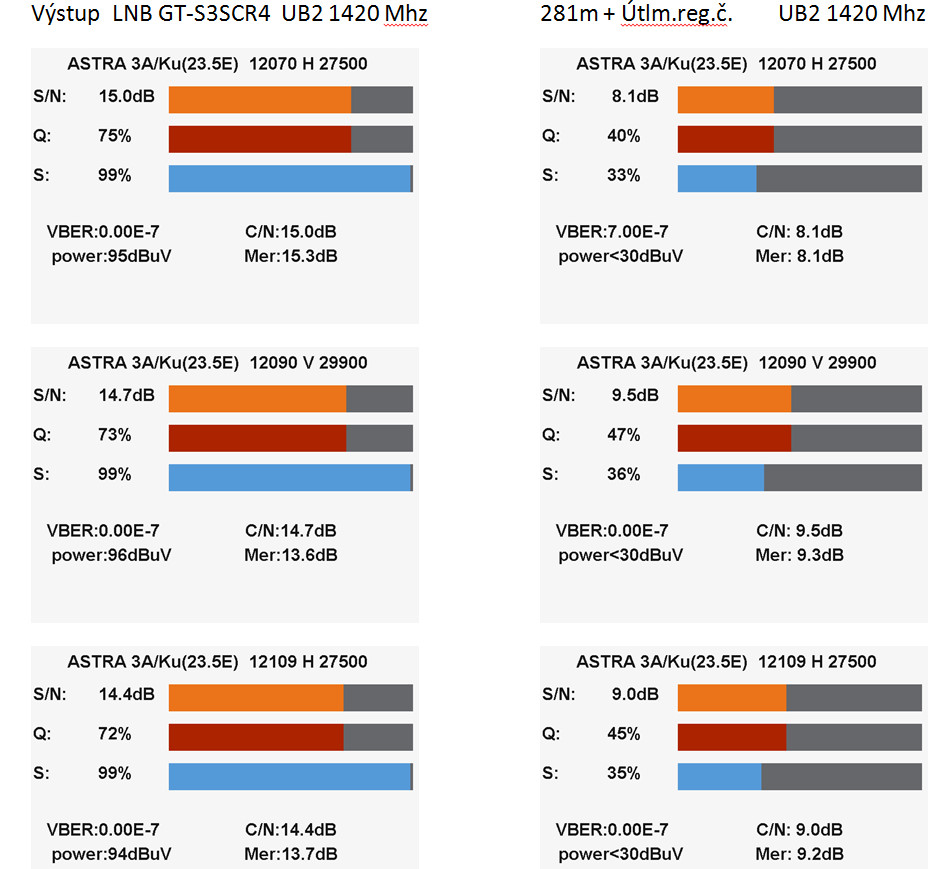 hraničné hodnoty dĺžky koaxiálneho káblu, pri ktorých je s testovaným LNB Unicable ešte možné stabilne prijímať satelitné vysielanie.