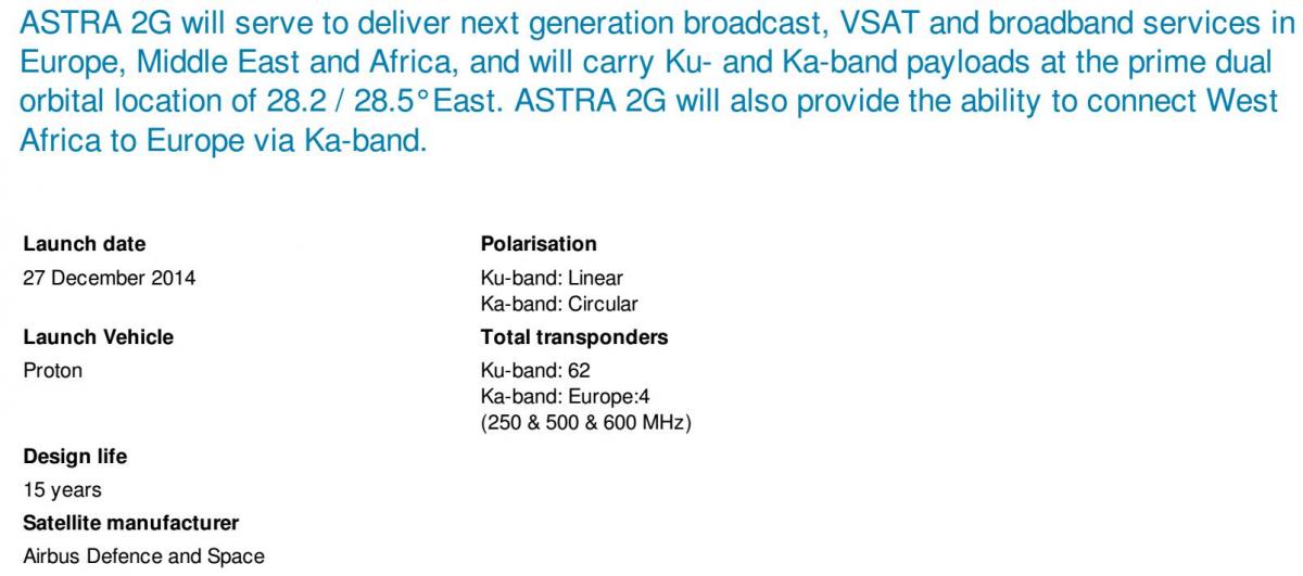 orbital slot in December 2014, at 03:37:49 Baikonur time.Astra 2G is positioned at 28.2°E (part of the Astra 28.2°E