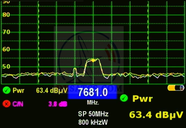 na f=7 681 MHz prvé FTA vysielanie v pásme X,ktorým je promo vysielanie operátora SES Astra vo formáte DVB-S/H-222 .