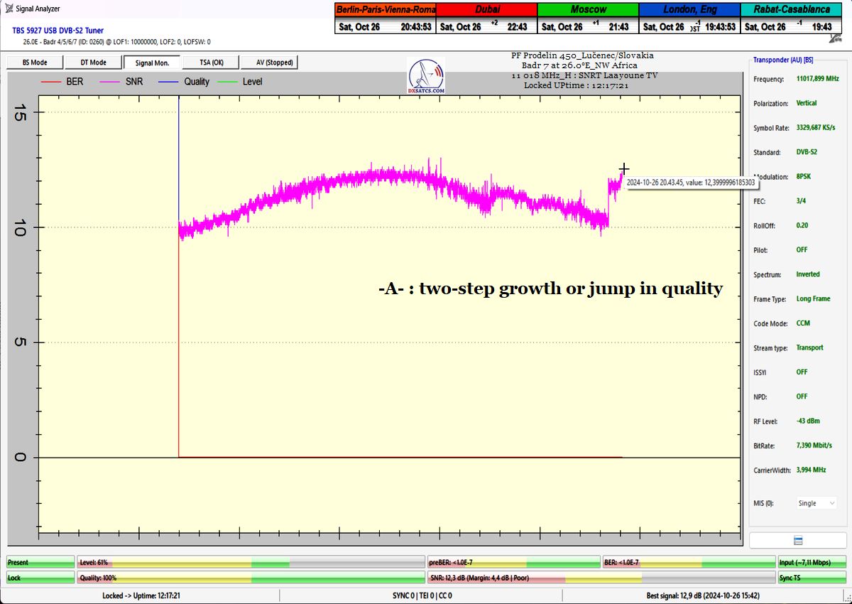 poznámka : V bode -A- došlo k neočakávanému pádu programu (ANY DESK) pre vzdialený prístup do druhého PC,ktorý používam pri replikácii, alebo vkladaní aktualizovaných dát do anténneho systému,ktoré budú platné v nasledovnom časovom úseku a bol som nútený počas monitoringu preinštalovať program a opätovne ho spojazdniť pri stále bežiacom monitoringu na danom PC,čo sa mi úspešne podarilo a nemusel som monitoring začínať od znovu. Spomínam to preto aby som vysvetlil dvoj-krokový rast alebo skok v kvalite,pretože rast kvality sa vo všetkých ostaných prípadoch demonštroval len v jednom kroku nie v dvoch ako je to v prípade bodu -A-