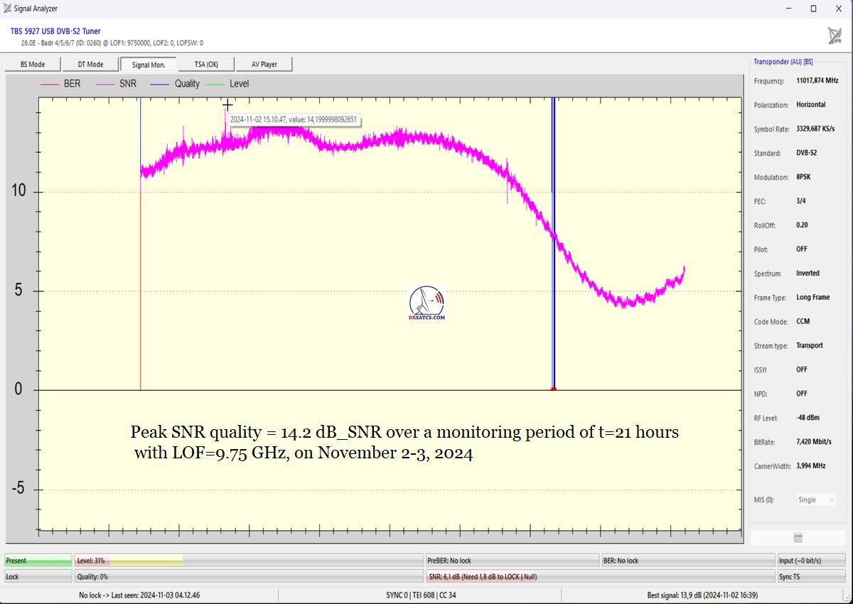 EN_Classification of achieved results at f=10,986 MHz: With the help of my original technological invention, named "Synchronous Nanocorrections," I indisputably achieved a stable carrier lock at 100% in a monitoring period of t=76 hours, without a single continuity dropout in its function. Depending on weather  conditions and the SMW-brand LNB used, peak quality ranged from 13.6 dB (at t=76 hours and LOF=10 GHz) to 14.2 dB_SNR (at t=21 hours and LOF=9.75 GHz).