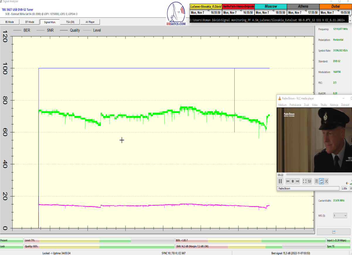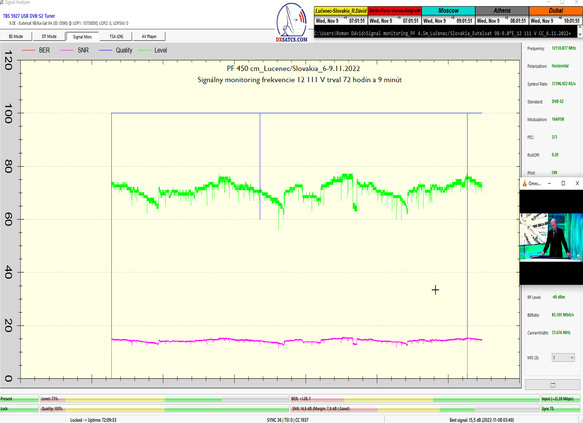 Priebežné stavy v signálnom monitoringu na f=12 341 MHz_V sa dokazujú v online video ukážkach,ktoré sa nedajú spochybniť.Kedže z principiálneho hľadiska platí že "Všetko sa dá spochybniť" moje argumenty znejú nasledovne : Signál s dostatočnou kvalitou sa nedá "svojpomocne vyrobiť " a priebehy a okamžité úrovne SNR,BER,Pwr... demonštrované v online video ukážkach sa nedajú zobrazovať a ani dodatočne upravovať v OFF-LINE režime,pretože ten neexistuje.To je dôvod prečo tak zdôrazňujem slovo ONLINE video ukážka