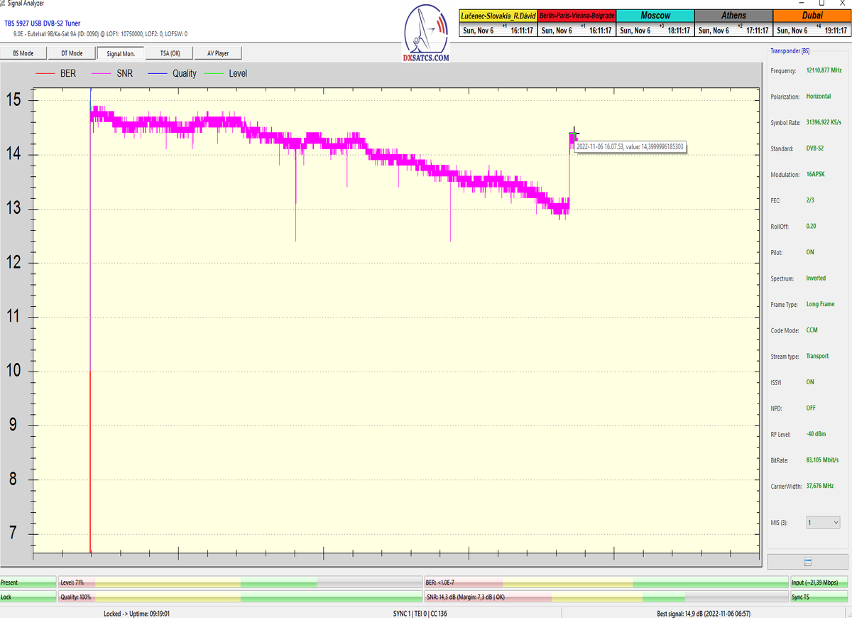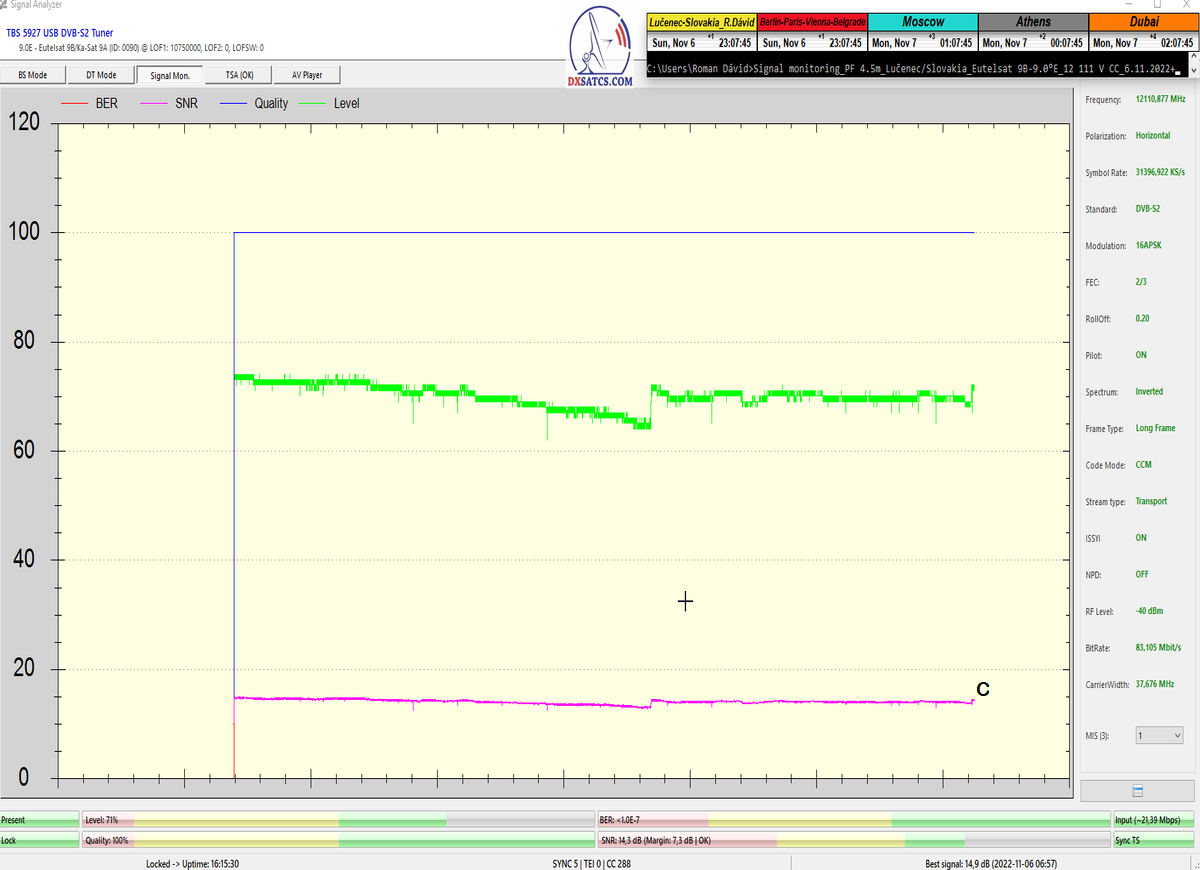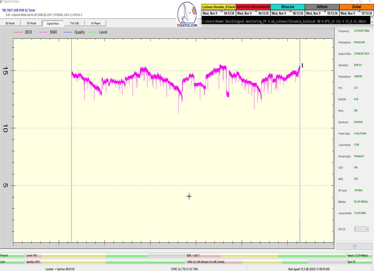 že či už som vykonal zber dát dňa 6.11,10.11 alebo 30.11.2022 nameral som porovnatelné špičky kvality príjmu od 15,3-15,5 dB_SNR/MER