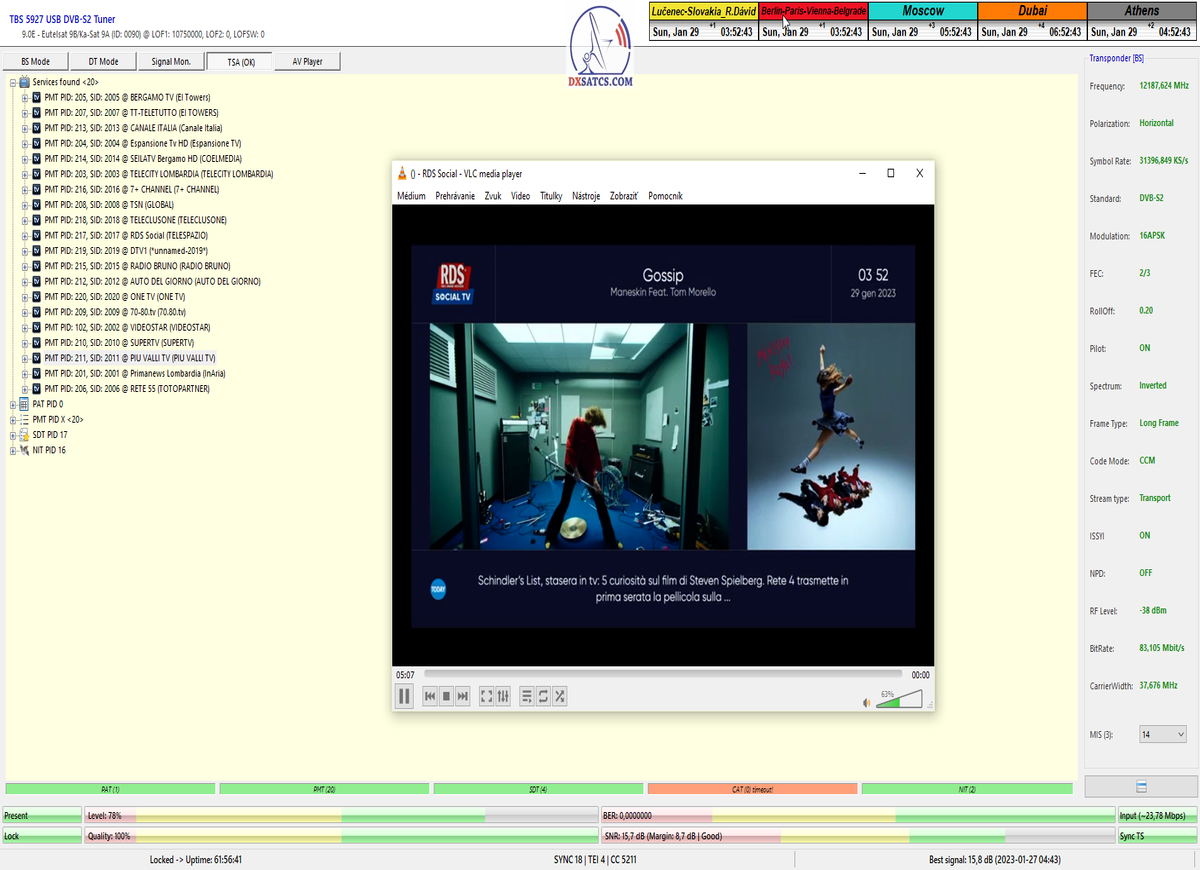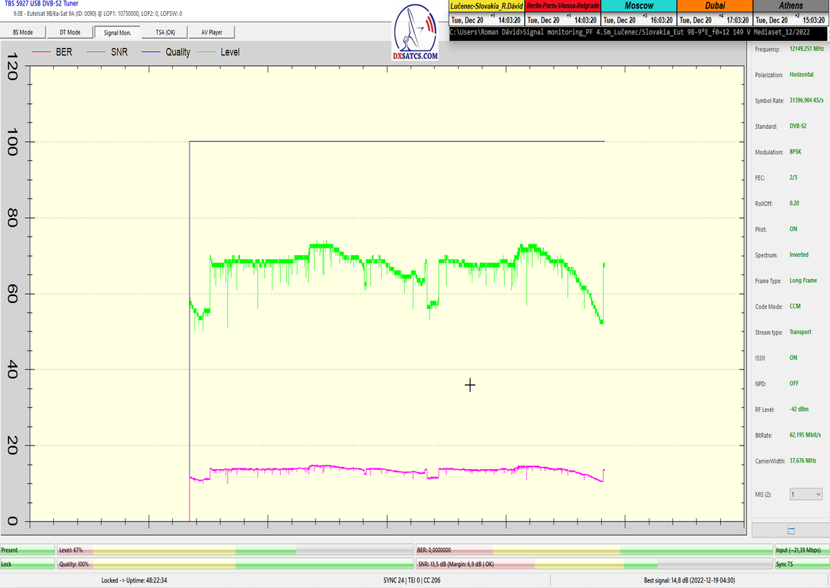 8.2.2023 : Na príklade dokazovania v signálnom monitoringu v dĺžke 1x73 hodín dnes nespochybniteľne dokážem začlenenie frekvencie f=12 188 MHz_V do DTH kategorizácie štandardnej formy konštantne stabilného satelitného príjmu (99,999%) s doteraz najvyššou špičkou kvality okolo SNR=15,8 dB ktorá sa opakuje každý deň.Z technologickej stránky je príjem z TP IT3 výnimočný hlavne tým že veľkosť uhlovej odchýlky SKEW ostáva konštantná aj pri výrazných zmenách v poveternostných podmienkach.Ďalej dnes dokážem plnú stabilitu príjmu v štandarde DVBS2-16APSK-Multistream aj pri intenzívnom snežení dňa 27.1.2023 so stabilnou výškou kvality okolo SNR=14,3 dB atď