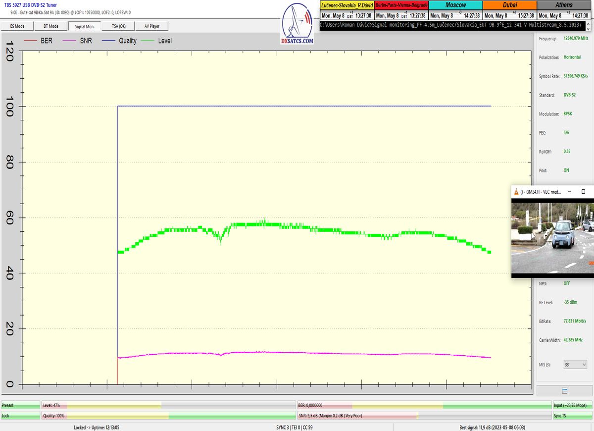 Terminológiou signálneho monitoringu a polopatisticky povedané : Vo výkonovom modele Jar/Leto dokážem (za predpokladu extrémne nedegradujúcich poveternostných podmienok) v praxi naplniť stabilnú formu príjmu v minimálnej a každodennej dĺžke t=12 hodín, odvodenú od minimálnej ale stabilenej výšky rezervy od 0,2 dB o 01:15 CET v noci až do 2,3 dB okolo 6:00 ráno.  Pravdivosť mojich predchádzajúcich tvrdení o stabilnej forme príjmu z f=12 341 MHz_V v minimálnej dĺžke t=12 hodín každý deň dokazujú 3 priebehy signálneho monitoringu vyhotovené od siedmeho do deviateho mája 2023 a tentoraz bez publikovaného dôkazu môžem potvrdiť že výška špičky kvality okolo SNR=11,8 dB a dĺžka "otvoreného" signálneho okna pre stabilný príjem je porovnatelná s rokom 2022,čiže z hľadiska intenzity výkonu EIRP medziročne nedochádza k prudkým zmenám v danom zemepisnom mieste.