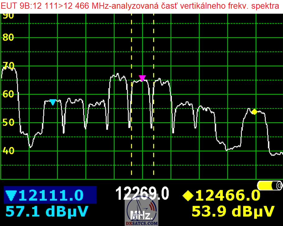 Analyzed frequency spectrum + polarisation 12 111 - 12 466 MHz , linear -V-