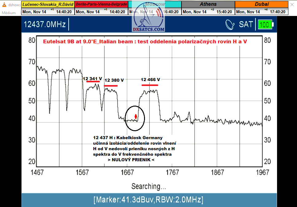 > táto moja "logická a zjednodušujúca myšlienková skratka" platí výlučne pre časť frekvenčného spektra od 12 111 do 12 466 MHz-V v zemepisných podmienkach strednej a východnej Európy družice Eutelsat 9B na 9.0°E pretože napríklad vo frekvenčnom spektre od 10,7 do 10,95 GHz GEO objektu Astra 2E_UK beam platí presný OPAK môjho predchádzajúceho tvrdenia pre identickú zemepisnú oblasť,pretože tam je miera vzájomnej