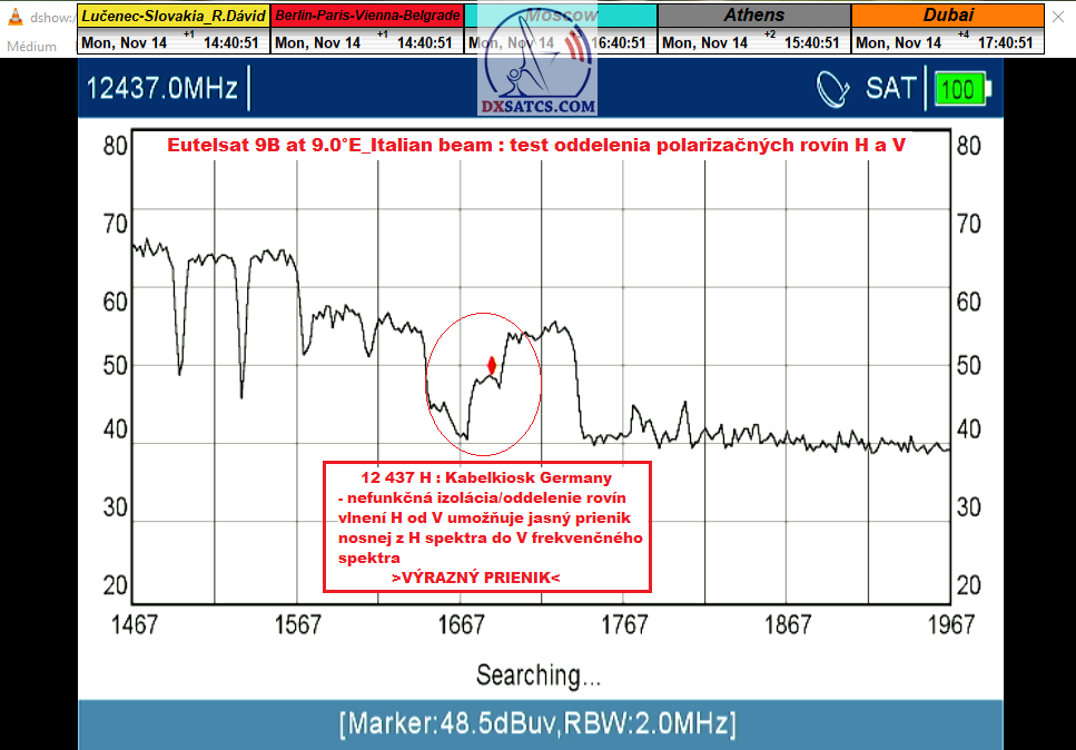 satelitov a hladinami EIRP=50-55 dBW,čo sú konkrétne v tomto prípade vlnenia vysielané v horizontálnej polarizácii. Pri výrobcom presne (ne)stanovenej , len "mlhavej-nekonkrétnej" hodnote izolácie H od V roviny , citujem "je vyššia ako 25 dB" síce bolo možné ! len nestabilne ! LOCK-núť všetkých 5 nosných pri amplitúde kvality okolo SNR=10-12 dB,ale výpadky v kontinuite LOCK-u  a pixelácia obrazu boli TRVALÉ. Inými slovami univerzálny princíp výberu a izolácie rovín vlnení ÚPLNE ZLYHAL,alebo inak povedané žiadna kvalita ale len nestabilný LOCK s trvalo oscilujúcou amplitúdou ne-kvality PER/MER/SNR.