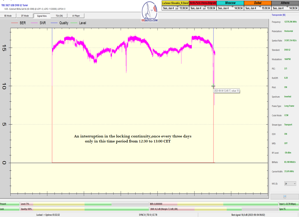 on the selected frequency from the spectrum between 12,111 and 12,466 MHz), into a daily peak quality of approximately SNR=16.6 dB,