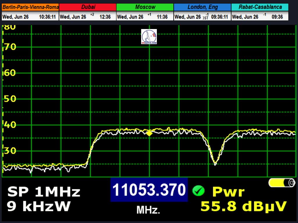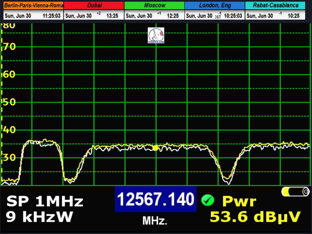 radio carrier Q-Music NL AMS at f=12,567.994 MHz through LOF2 and 12,567.941 MHz through LOF1, resulting in an offset of exactly 53 kHz between