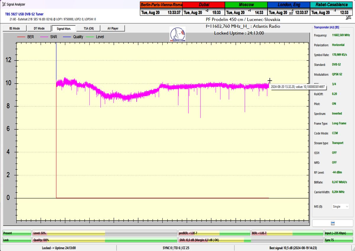 so špičkou kvality SNR=10,8 dB a to pri ideálnych poveternostných podmienkach.Typická signálna rezerva počas dňa permanentne oscilovala v rozsahu špičiek od 5 do 6,8 dB.