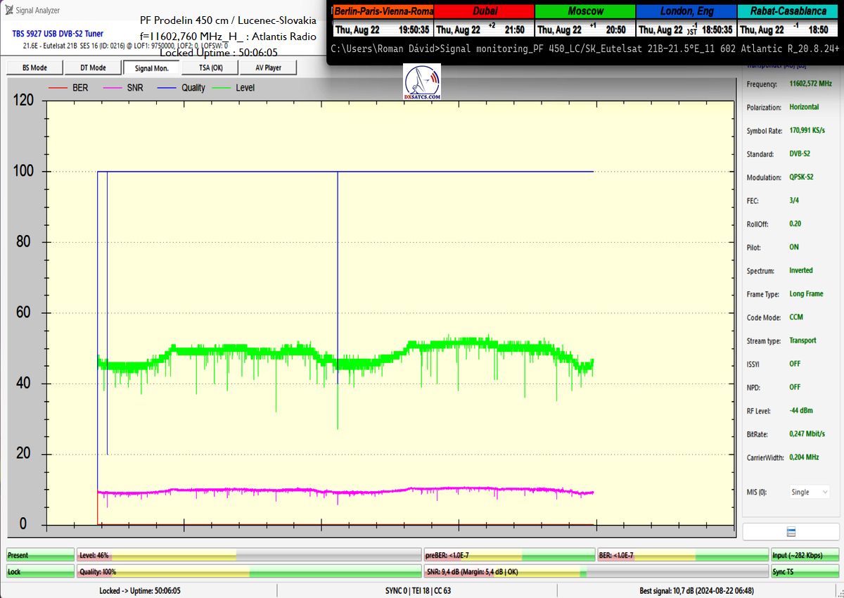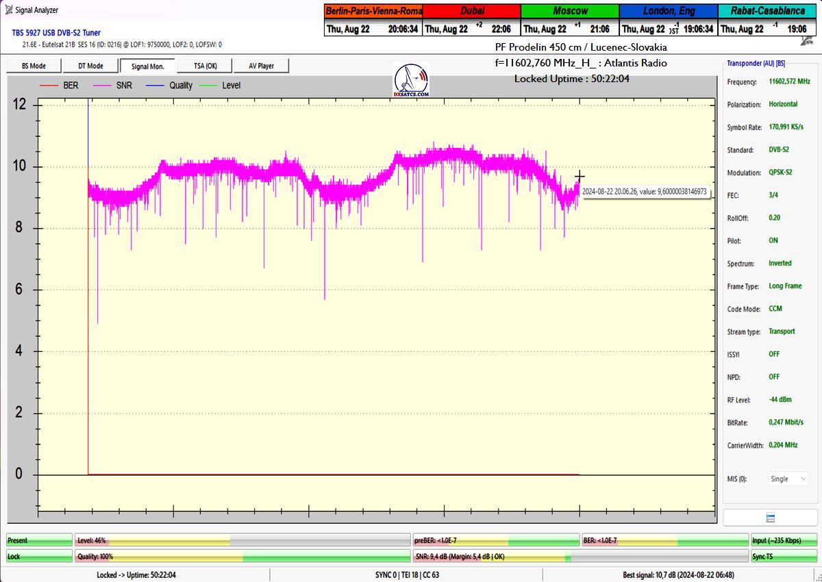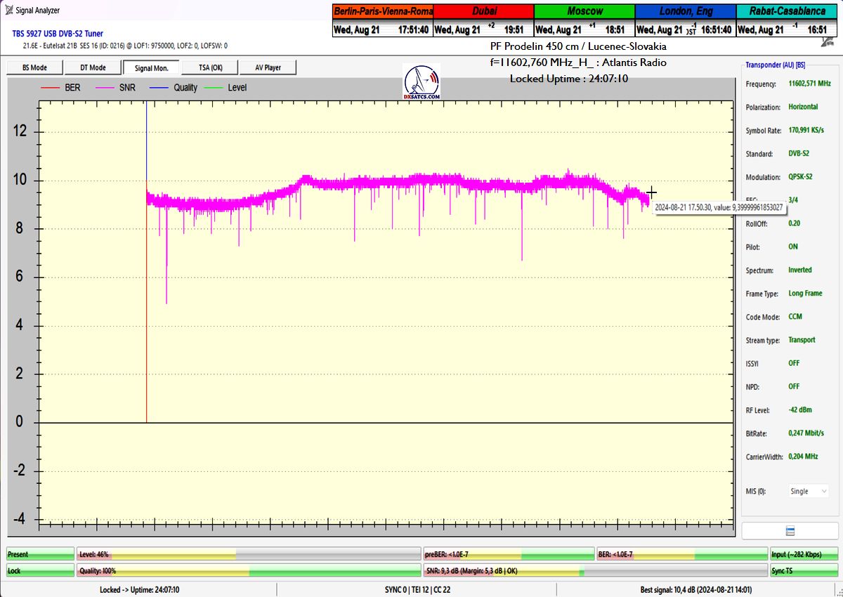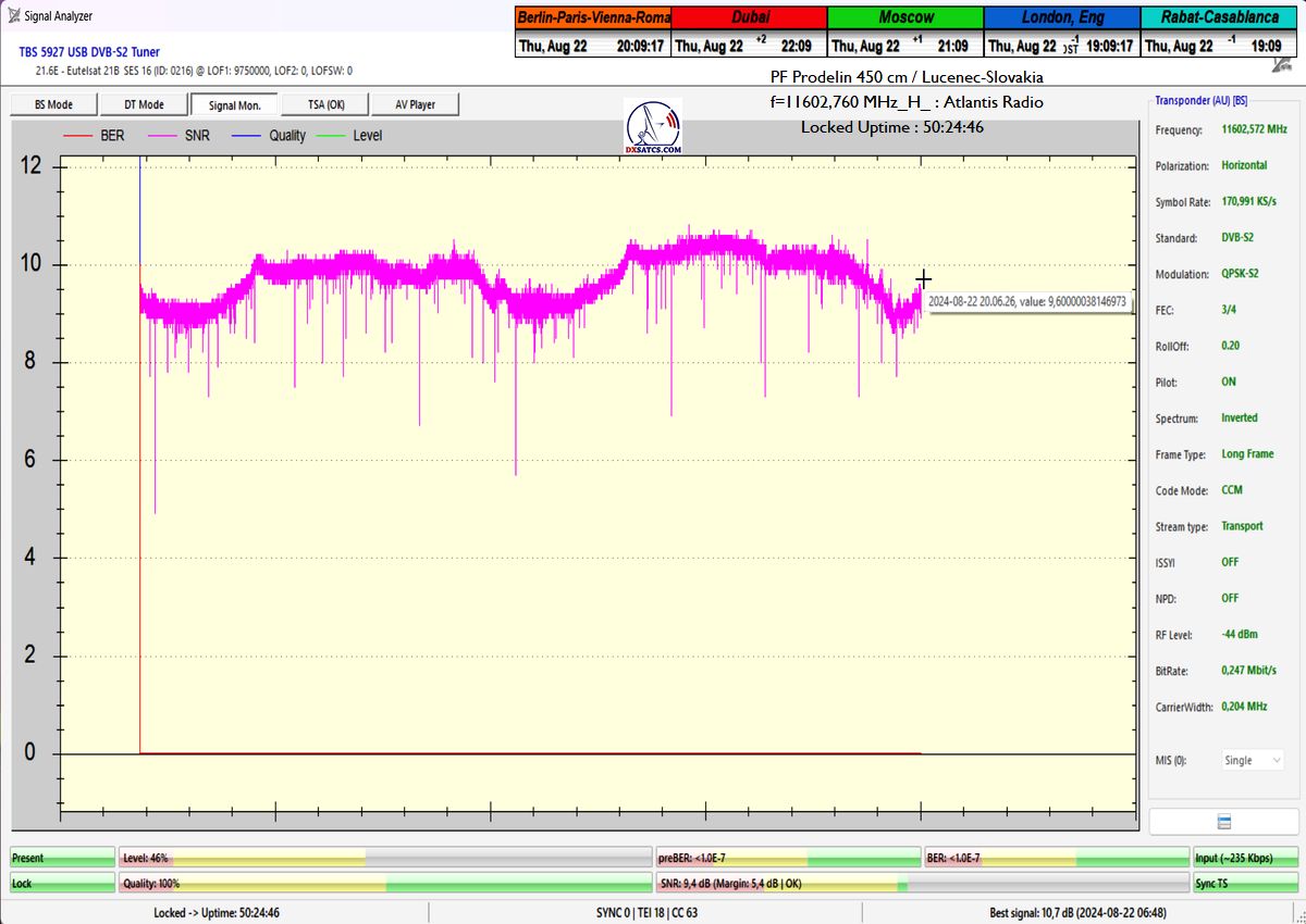 Eng_Classification of achieved results at f=11 602,760 MHz: PF 450 cm_The visualized form of proof, based on continuous signal monitoring over a time period of t=50+24 hours, unequivocally confirms that I have achieved a stable reception in practice at 100% without a single dropout in connection with the Lock process, with a peak SNR quality of 10.8 dB under ideal weather conditions. The typical signal margin during the day consistently oscillated in a peak range from 5 to 6.8 dB.
