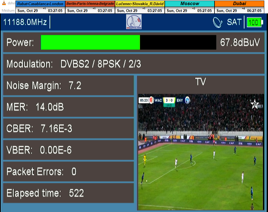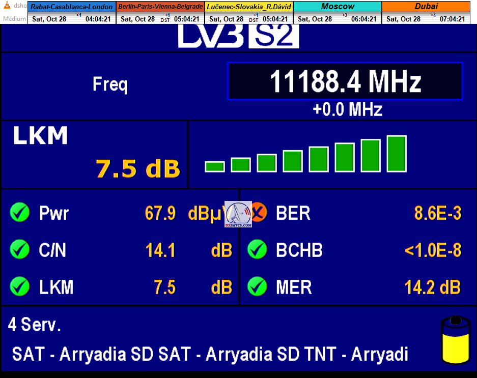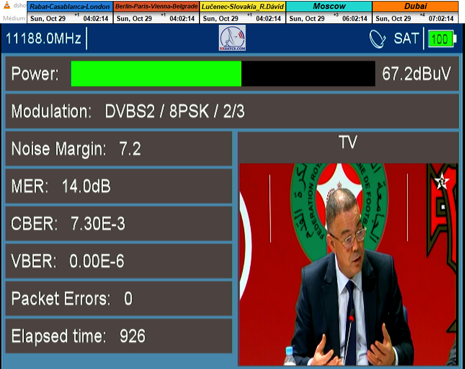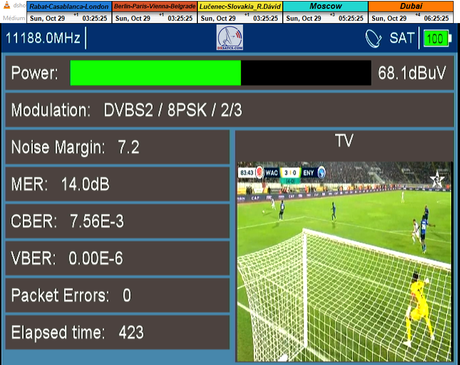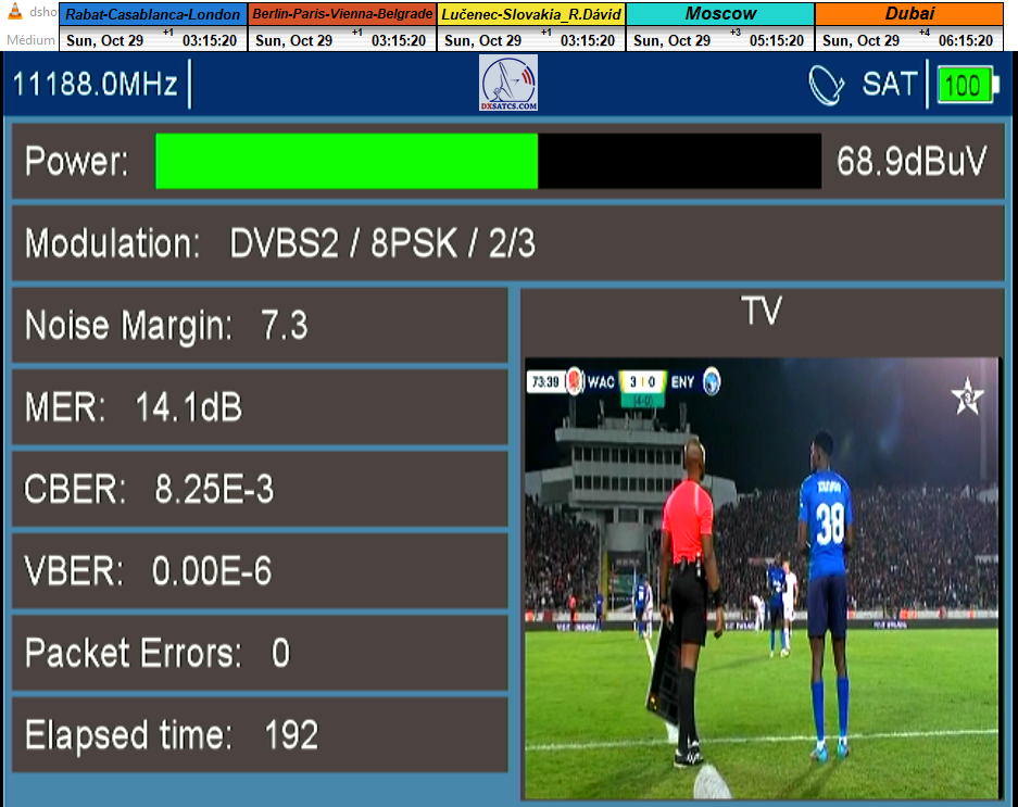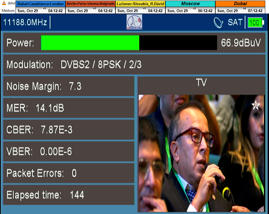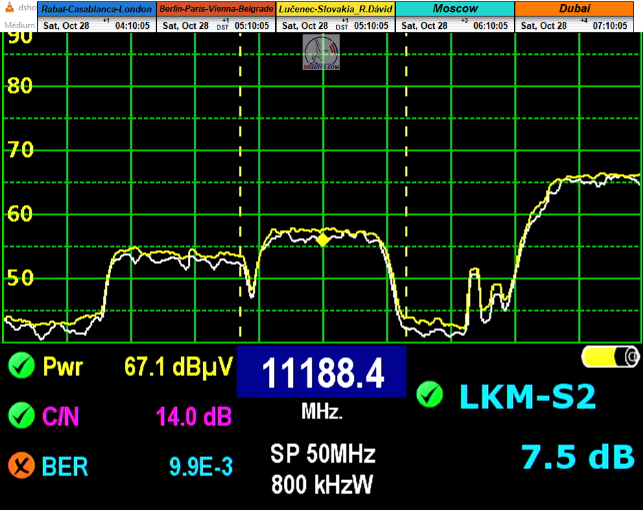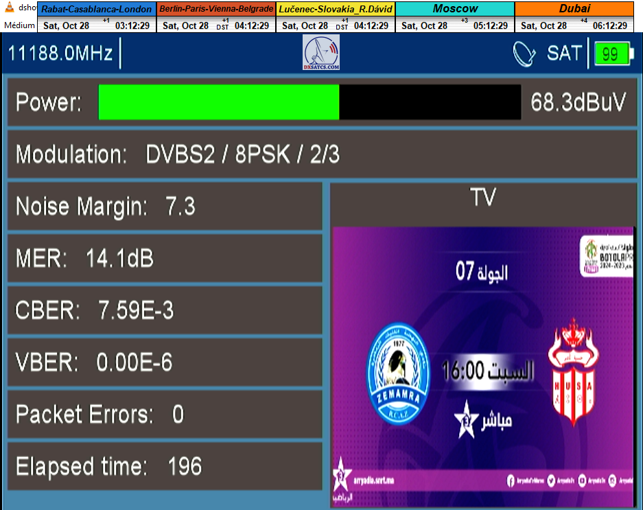 v štandarde DVB-S2/8PSK,dnes dokážem dosiahnutie exemplárneho stavu aj pri vysokom úhrne zrážok na frekvencii marockého provajdera SNRT Arryadia