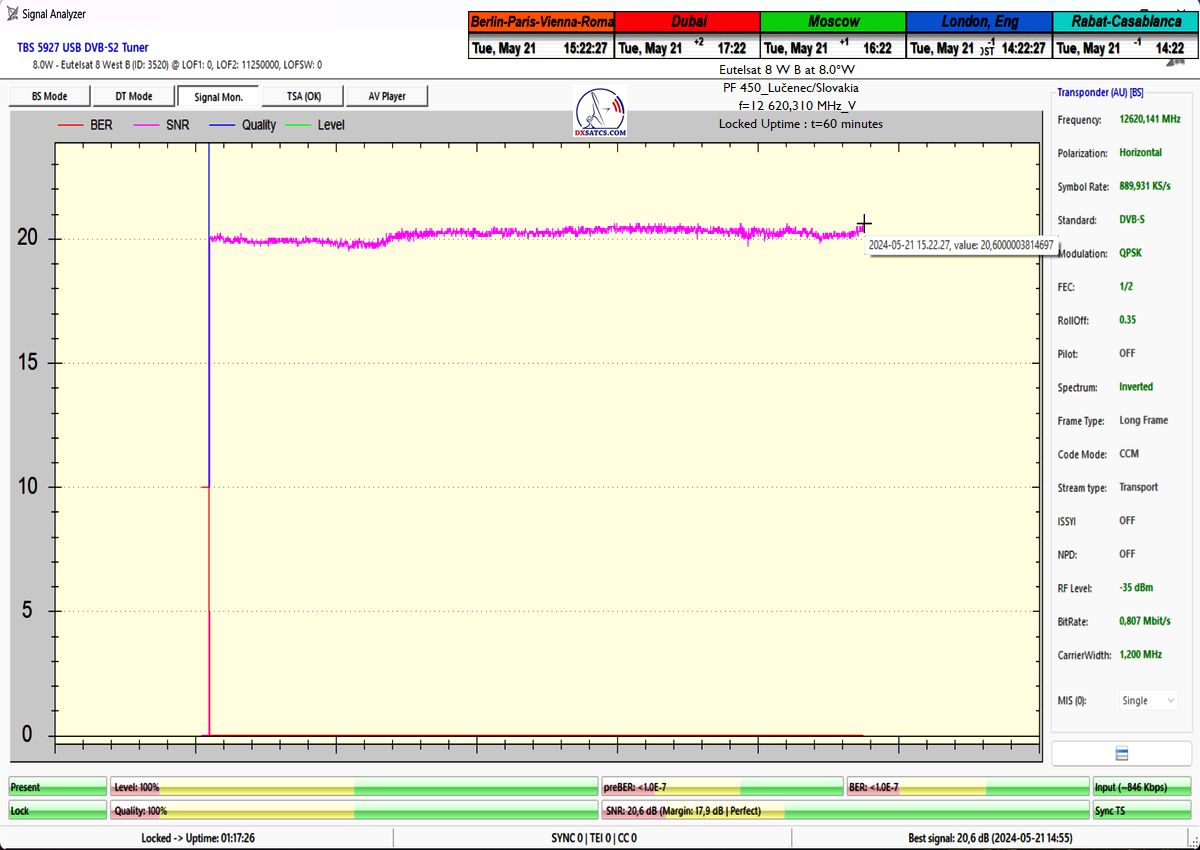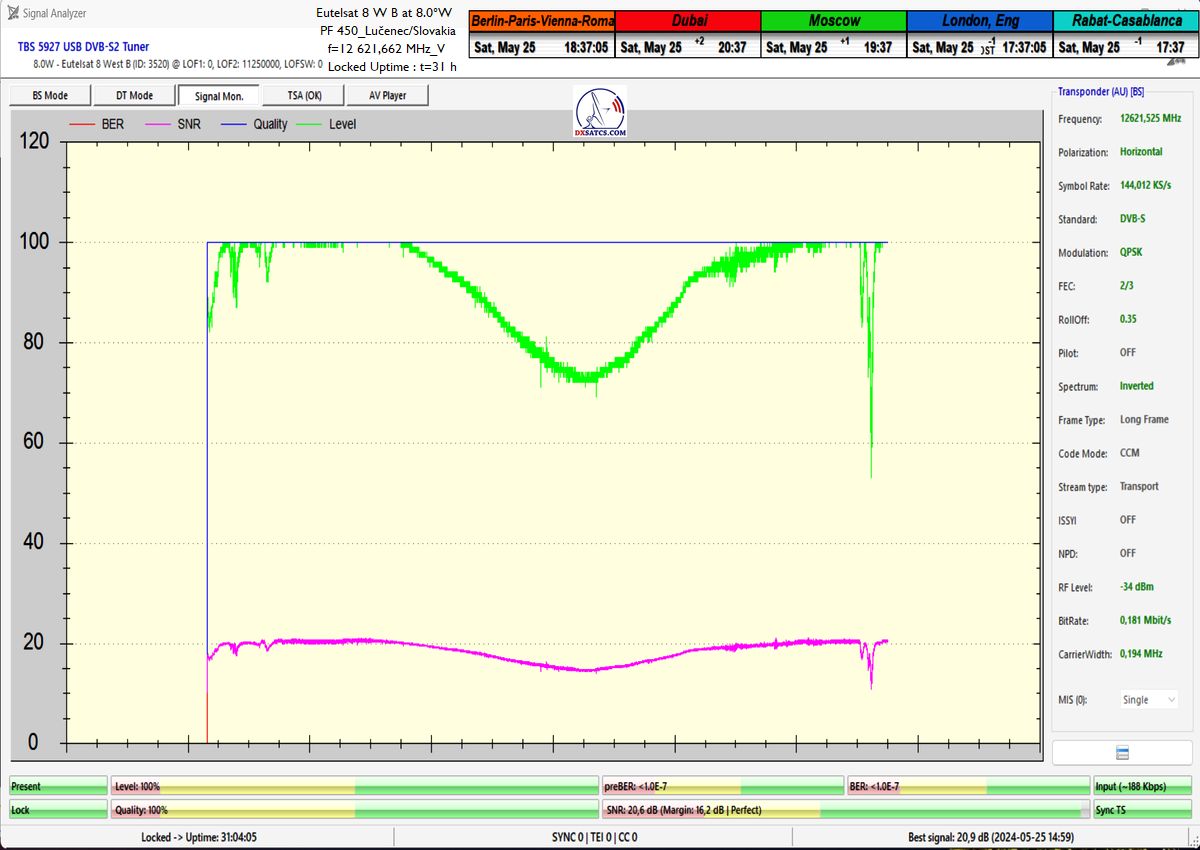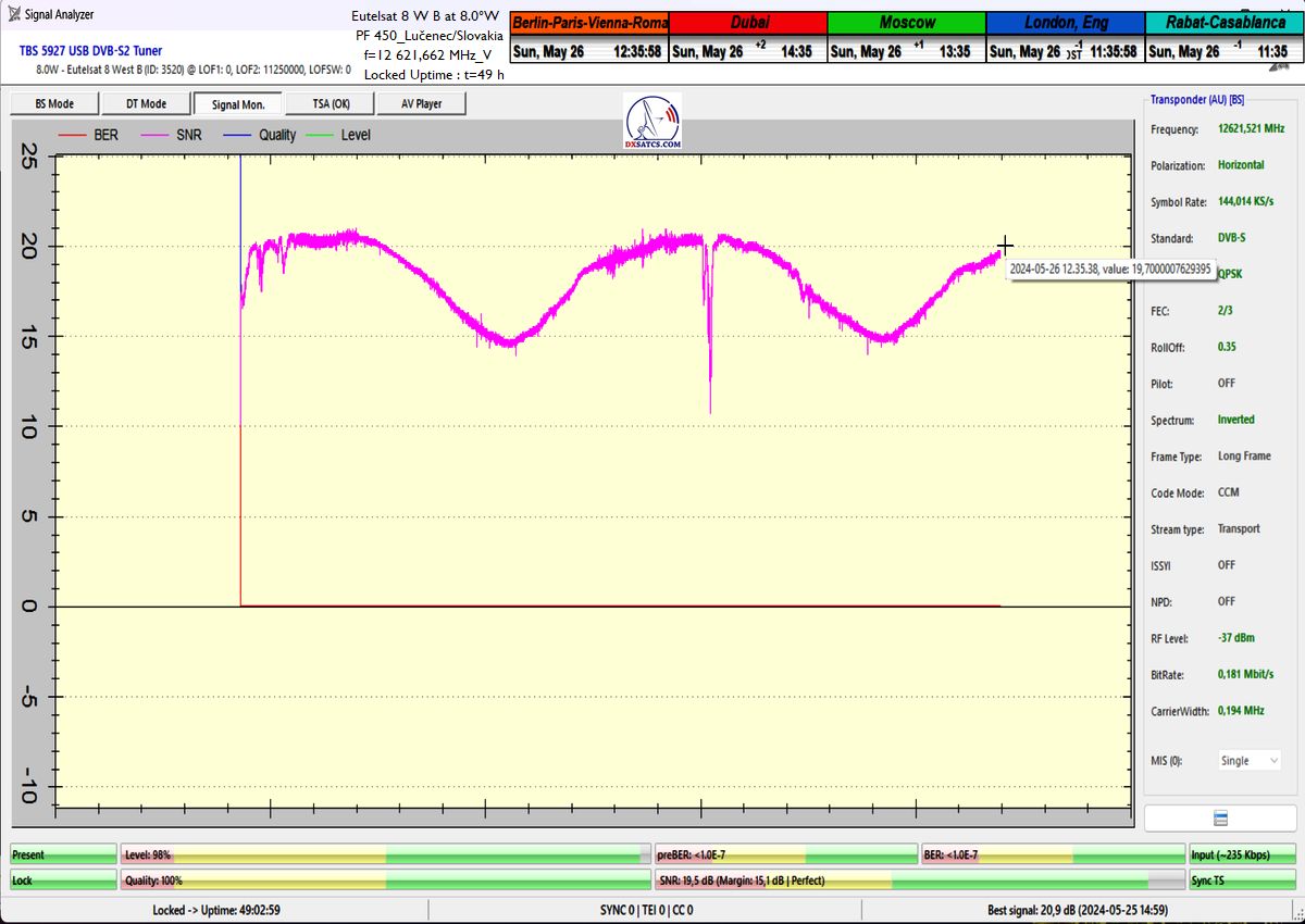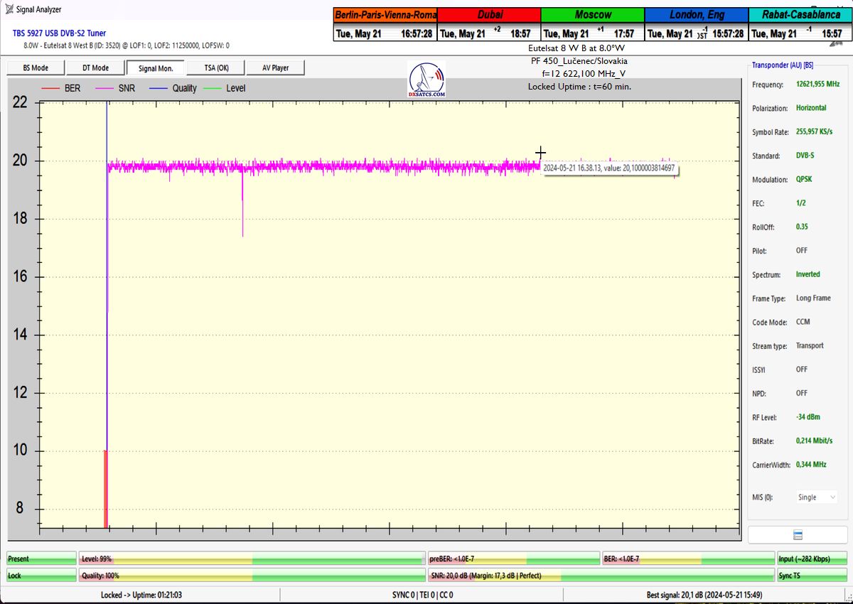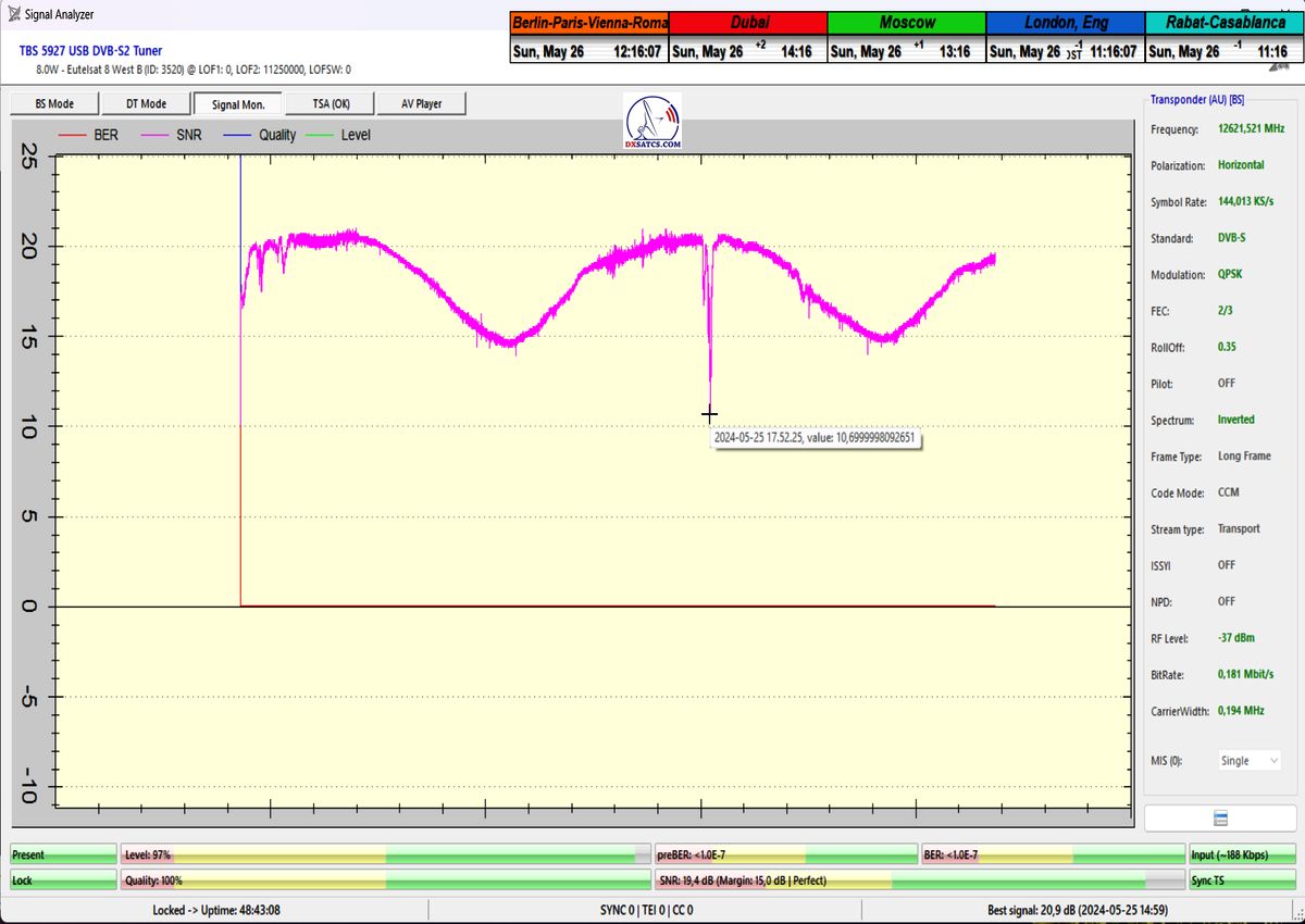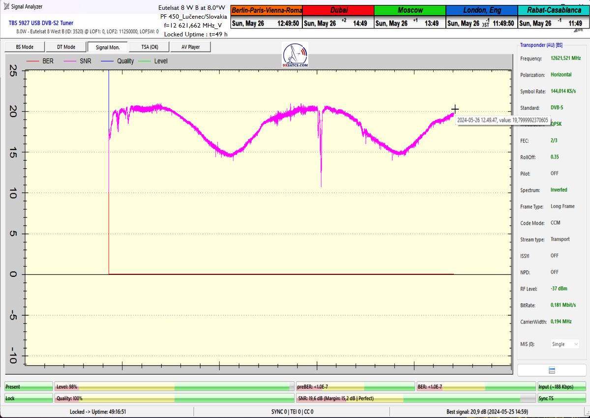výrazne osciluje od približne 14 do 21 dB v jednotke odstupu Šignal/Šum_SNR a pri prechode prívalových búrok výrazne klesá až na 10,5 dB, pri dostatočne vysokej okamžitej rezerve okolo 5 dB.Typická výška signálnej rezervy pri štandardných a výrazne nezhoršených poveternostných podmienkach osciluje v rozsahu od 9 do 16,5 dB.Spracovanie rádiových nosných s vyššími úrovňami symbolových rýchlostí ako SR>200 ksym/s nepovažujem z technologického hľadiska za nič fyzikálne a ani softwérovo zložité a neštandardné z pohľadu dosiahnutia kontinuity LOCK-u a v podmienkach provajderom garantovane vysokých intenzín výkonu (EIRP=53 dBW) v európskom vyžarovcom diagrame družice Eutelsat 8 West B ich stabilitu príjmu nemusím a ani nebudem dokazovať a zvolil som len minimálnu verifikačnú jednotku t=60 minút,aby som sa vyhol prezentácii "bezcenných" sekundových Lockov z frekvenčného spektra.