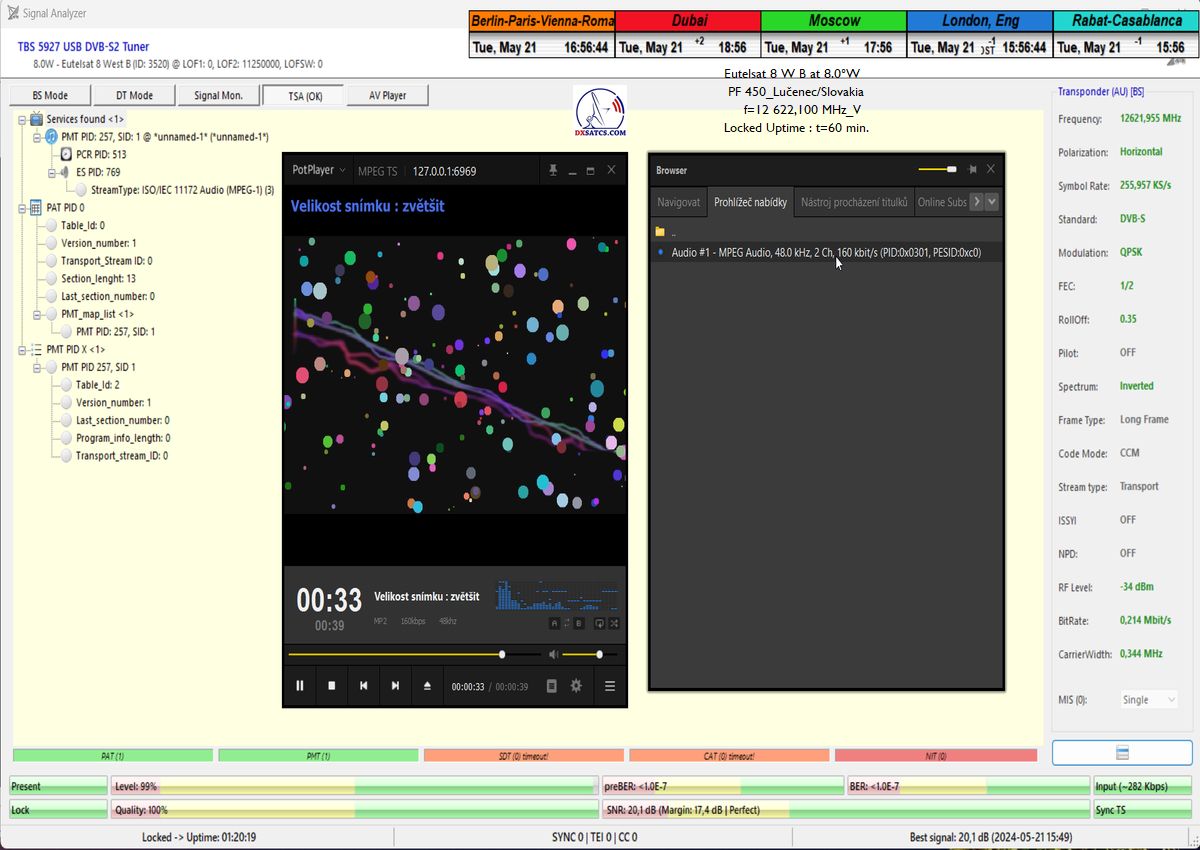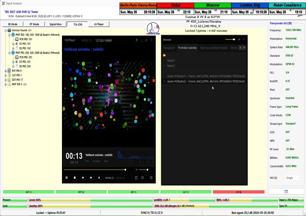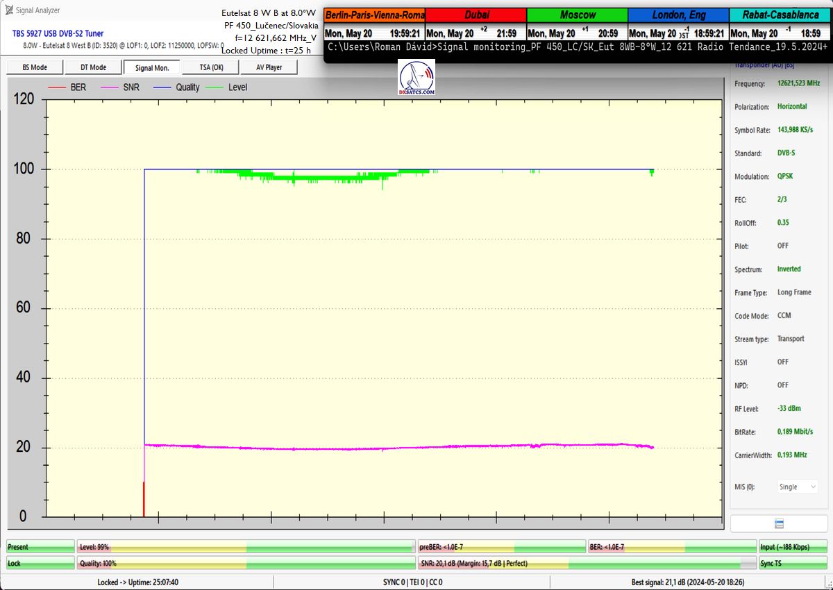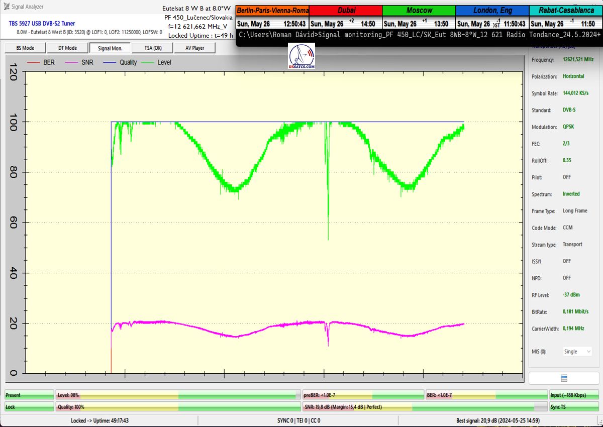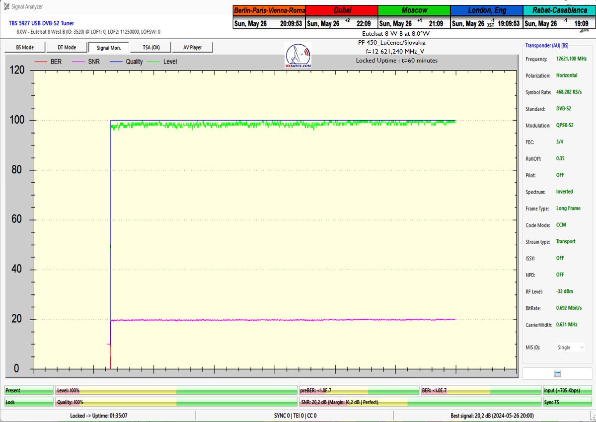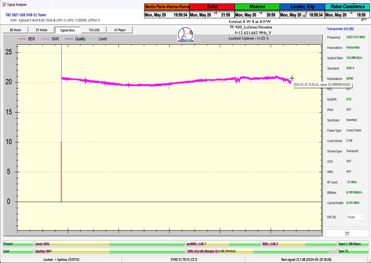 výrazne osciluje od približne 14 do 21 dB v jednotke odstupu Šignal/Šum_SNR a pri prechode prívalových búrok výrazne klesá až na 10,5 dB, pri dostatočne vysokej okamžitej rezerve okolo 5 dB.Typická výška signálnej rezervy pri štandardných a výrazne nezhoršených poveternostných podmienkach osciluje v rozsahu od 9 do 16,5 dB.Spracovanie rádiových nosných s vyššími úrovňami symbolových rýchlostí ako SR>200 ksym/s nepovažujem z technologického hľadiska za nič fyzikálne a ani softwérovo zložité a neštandardné z pohľadu dosiahnutia kontinuity LOCK-u a v podmienkach provajderom garantovane vysokých intenzín výkonu (EIRP=53 dBW) v európskom vyžarovcom diagrame družice Eutelsat 8 West B ich stabilitu príjmu nemusím a ani nebudem dokazovať a zvolil som len minimálnu verifikačnú jednotku t=60 minút,aby som sa vyhol prezentácii "bezcenných" sekundových Lockov z frekvenčného spektra.