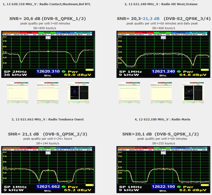 ►Auf Deutsch_Klassifikation der erreichten Ergebnisse bei f=12 621,662 MHz: Das von mir vorgeschlagene methodische Verfahren zur Messung und Präsentation unbestreitbarer Ergebnisse verifiziert durch visuelle Beweisführung den Zustand der Erreichung eines stabilen Empfangs zu 100 % in einer Überwachungseinheit von t=49 Stunden auf dem SCPC-Träger von Tendance Ouest Radio mit einer angewandten Symbolrate (SR) von 144 ksym/s. Der Qualitätsspitzenwert schwankt derzeit und Ende Mai erheblich zwischen etwa 14 und 21 dB in der Einheit Signal-Rausch-Verhältnis (SNR) und sinkt bei heftigen Regenstürmen deutlich auf 10,5 dB, bei einer ausreichend hohen momentanen Reserve von etwa 5 dB. Die typische Höhe der Signalreserve