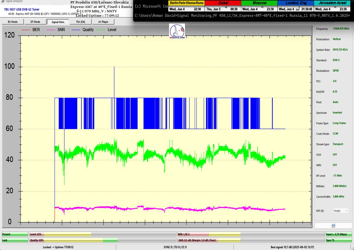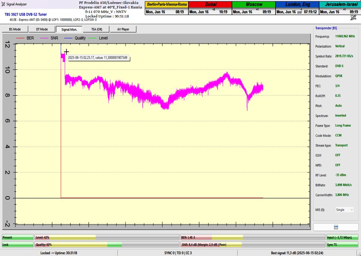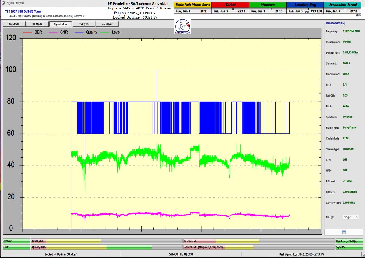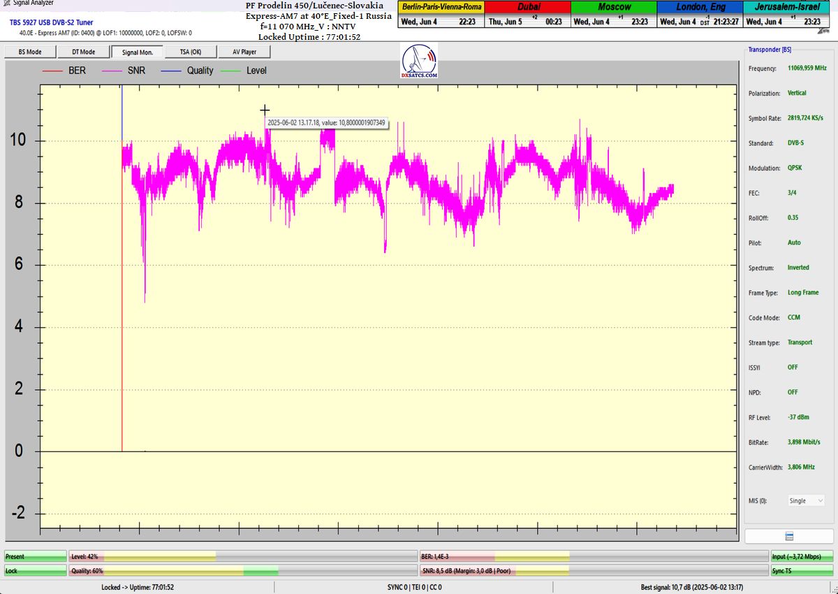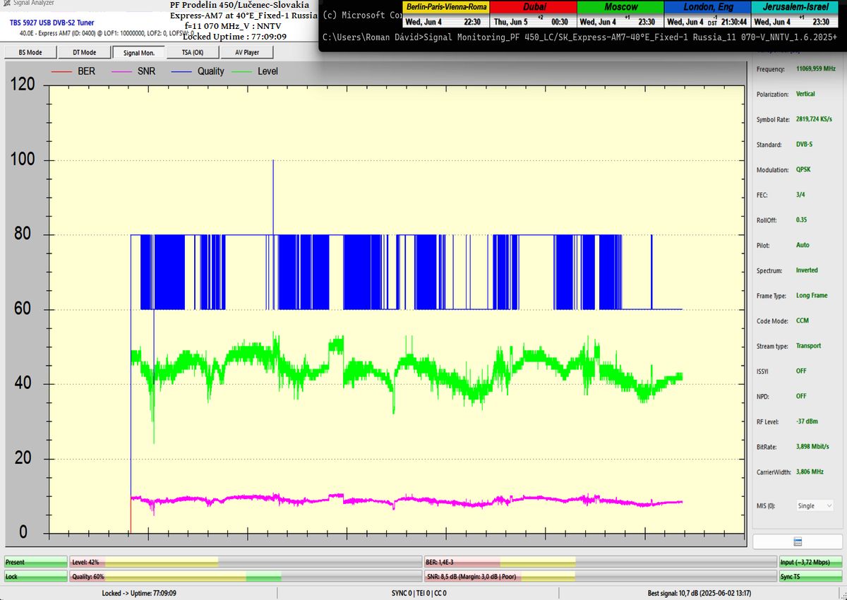 ENG_The results of signal monitoring unequivocally confirm that during the verification interval of t = 77 hours, for the NNTV carrier frequency at f = 11,070 MHz_V, I demonstrably achieved 100% stable reception without a single occurrence of signal loss related to Lock status or pixelation.A peak SNR quality of 10.7 dB was recorded, and the only instance of a drop in the blue Q-quality curve to the level of Q = 40% occurred exactly once — following the arrival of storm cloud cover and the onset of rain showers on June 1, 2025 at precisely 20:35 CET, as irrefutably verified by precipitation data from the source shmu.sk.