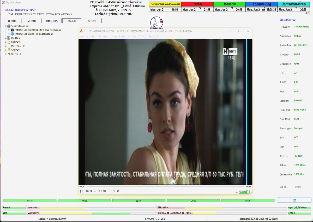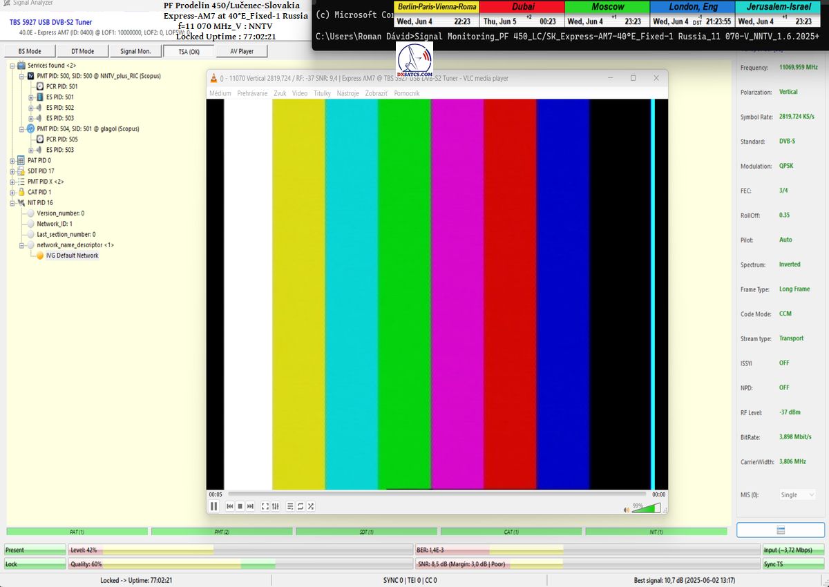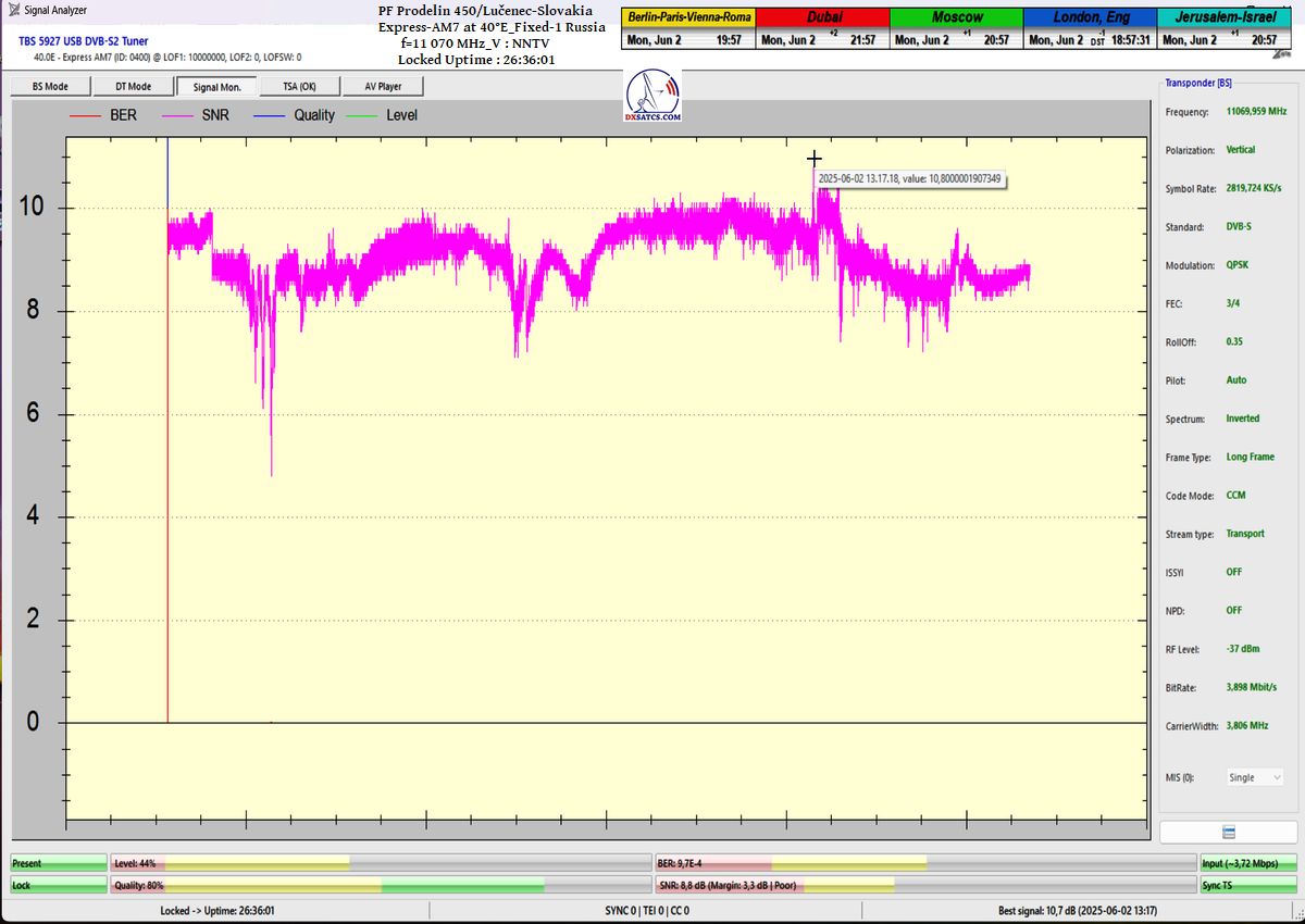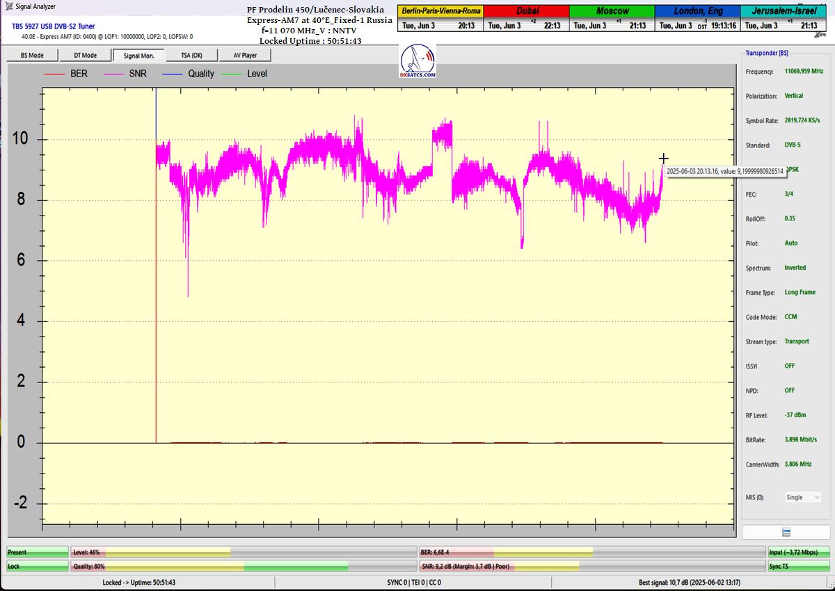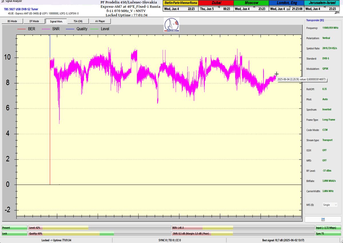 ENG_The results of signal monitoring unequivocally confirm that during the verification interval of t = 77 hours, for the NNTV carrier frequency at f = 11,070 MHz_V, I demonstrably achieved 100% stable reception without a single occurrence of signal loss related to Lock status or pixelation.A peak SNR quality of 10.7 dB was recorded, and the only instance of a drop in the blue Q-quality curve to the level of Q = 40% occurred exactly once — following the arrival of storm cloud cover and the onset of rain showers on June 1, 2025 at precisely 20:35 CET, as irrefutably verified by precipitation data from the source shmu.sk.