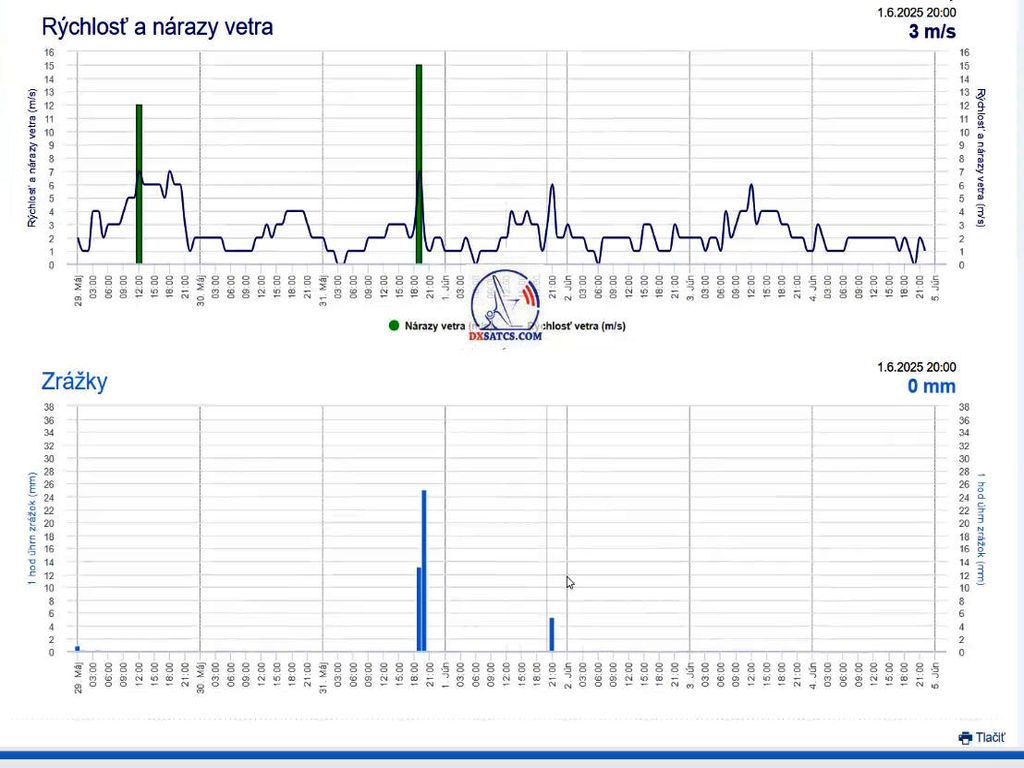 – ohne auch nur einen einzigen Ausfall im Zusammenhang mit Lock-Status oder Pixelbildung.Ein Spitzenwert der SNR-Qualität von 10,7 dB wurde gemessen, und der einzige registrierte Abfall der blauen Qualitätskurve Q auf ein Niveau von Q = 40 % trat exakt einmal auf – nämlich nach dem Eintreffen einer Gewitterwolkenfront und dem Beginn von Regenschauern am 1.6.2025 um genau 20:35 MEZ, wie durch die gemessenen Niederschlagsdaten der Quelle shmu.sk eindeutig belegt wird.
