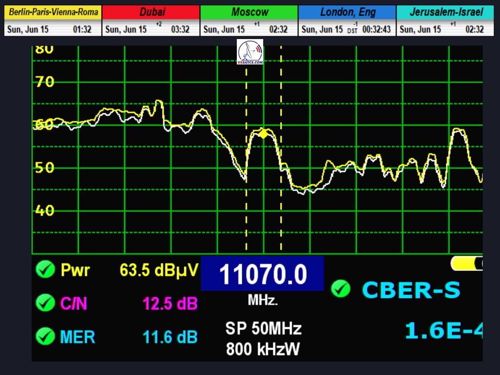 ►Modulácia: QPSK (DVB-S) ►Špička kvality SNR:10,7 dB (celková špička SNR=11,3 dB)