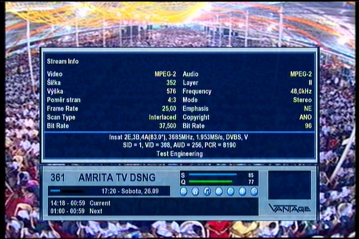 Insat 2E at 83.0°E - Wide footprint - C band : feeds _ 3 685 V Amrita TV DSNG _ SR=1 953 KS/s _ Test Engineering