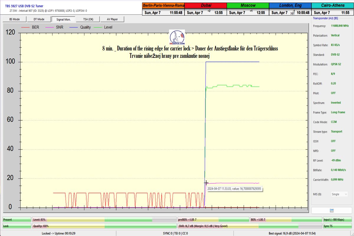 beweist,dass die HW/SW-Konfiguration der PC-Karte TBS 5927 und des Programms EBSpro auch bei den niedrigsten Symbolraten (SR),konkret SR=83 ksym/s,