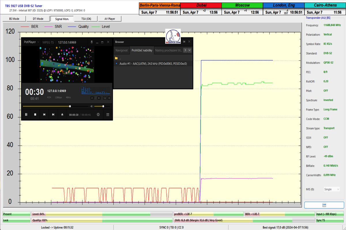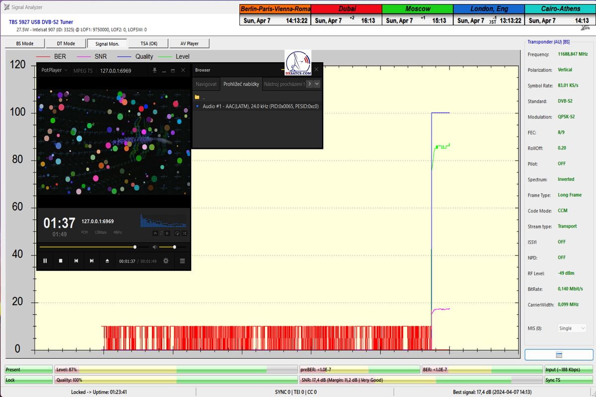 Každá z frekvencií na ktorých je nosná zamknutá a demonštrovaná HW/SW konfiguráciou DVB-S2 PC karta TBS 5927 & SW EBSPro je podladená