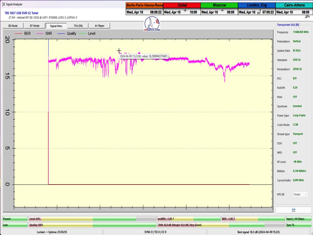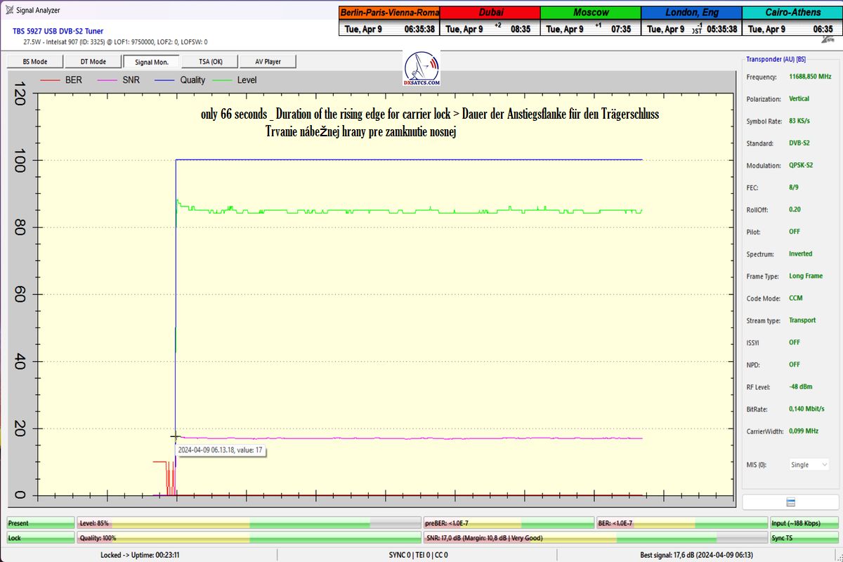 zweifelsfrei,dass ich ein konstantes LOCK-Verhalten mit einem Spitzen-SNR-Qualität von 17 dB erreicht habe,ohne Unterbrechung in der Kontinuität