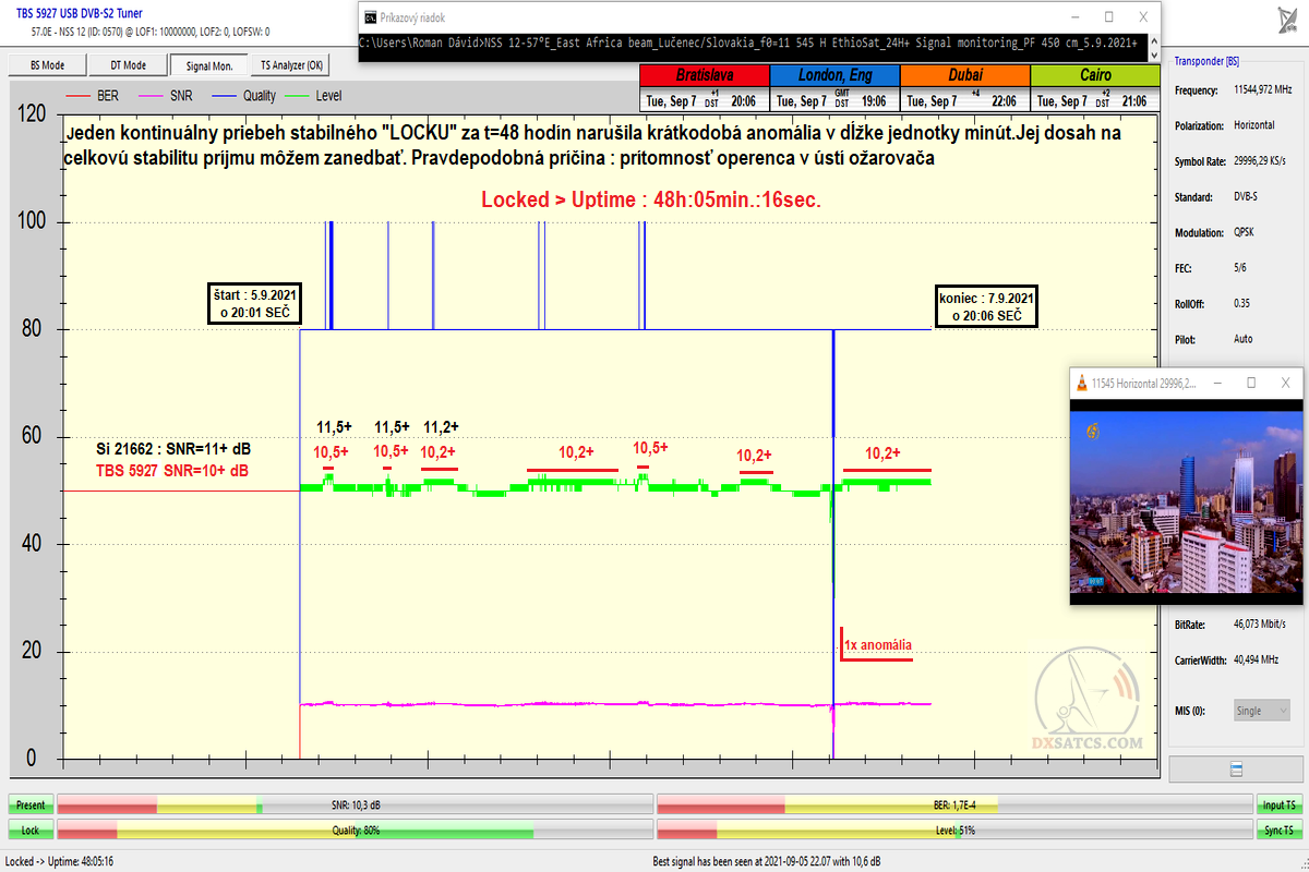 A práve tento typ môjho staronového vlnovodu z roku 2009 s jedným neštandardným/netabuľkovým rozmerom som aplikoval pri nasledujúcom dokazovaní v podobe kontinuálne/neprerušovane vykonávaného signálneho monitoringu na referenčnej frekvencii f0=11 545 H satelitnej siete Ethiosat až do momentu celkového vypnutia jej satelitnej distribúcie dňa 21.11.2021 o 23:21 SEČ. Nasledujúca vizualizácia dosiahnutej kvality na referenčnej frekvencii "f0" v celkovej dĺžke t=30+43 (73) hodín s :