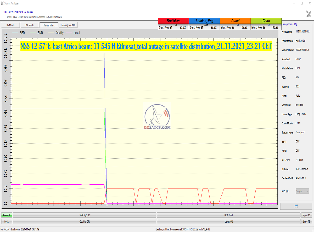 ►Okamih prerušenia satelitnej distribúcie platformy Ethiosat Etiópia z družice NSS 12 na 57°E : 21.11.2021 o 23:21 SEČ_bol som online dôkaz z monitoringu : NO LOCK Last seen : 2021-11-21 _ 23:21:49