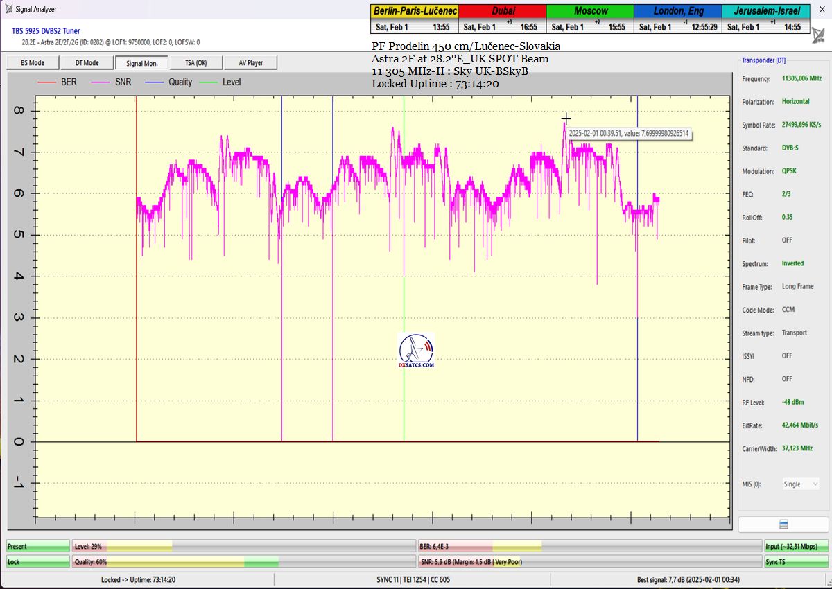 Teraz prejdem k analýze dosiahnutých výsledkov na pôvodne referenčnej frekvencii f0=11 426 MHz_H pre celú konšteláciu družíc v stope UK SPOT BEAM. Len na základe naplnenia mnou zadefinovaného metodického postupu meraní a zberu dát z kontinuálneho signálneho monitoringu,ktorý je verifikovaný dostatočne dlhou jednotkou t=72 hodín , môžem teraz tvrdiť že podobne ako na TP 109-11 305-H_A2F som len v jednotke t=24 hodín dosiahol stabilitu príjmu na 100% bez jediného výpadku v Locku a bez čo i len jediného sekundového mikrozamrznutia streamu,ktorý sa prejavuje sekundovým pádom modrého priebehu kvality Q na základňu.Okamžitý návrat modrého priebehu kvality Q na pôvodnú hladinu dokazuje že sa skutočne jedná len o sekundové mikrozamrznutie streamu a nie o výpadok v Locku,ktorý sa vizualizuje v priebehu súvislou červenou plochou,čiže sa stále pohybujeme vo forme dokázanej stability len mierne negovanej/rušenej