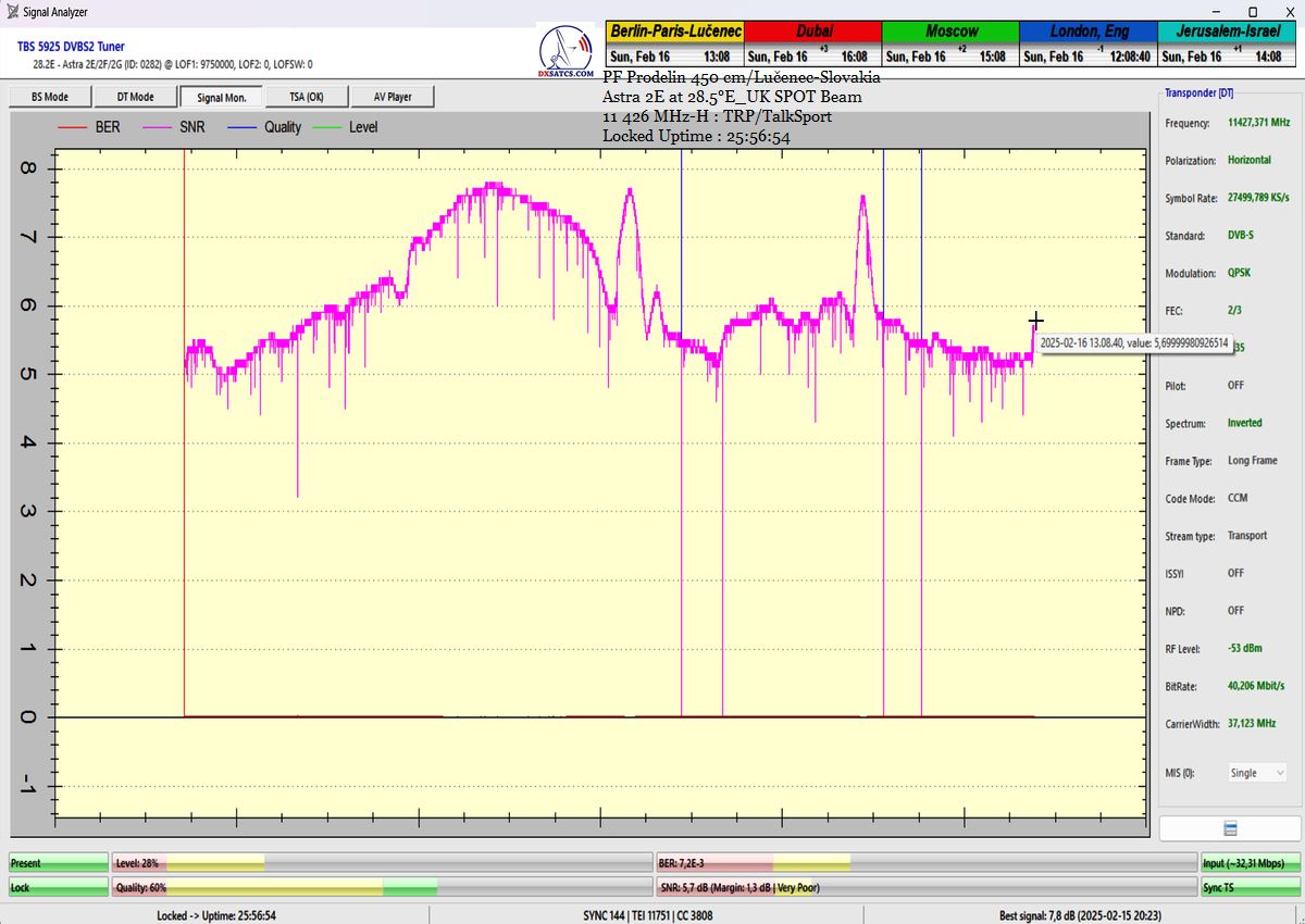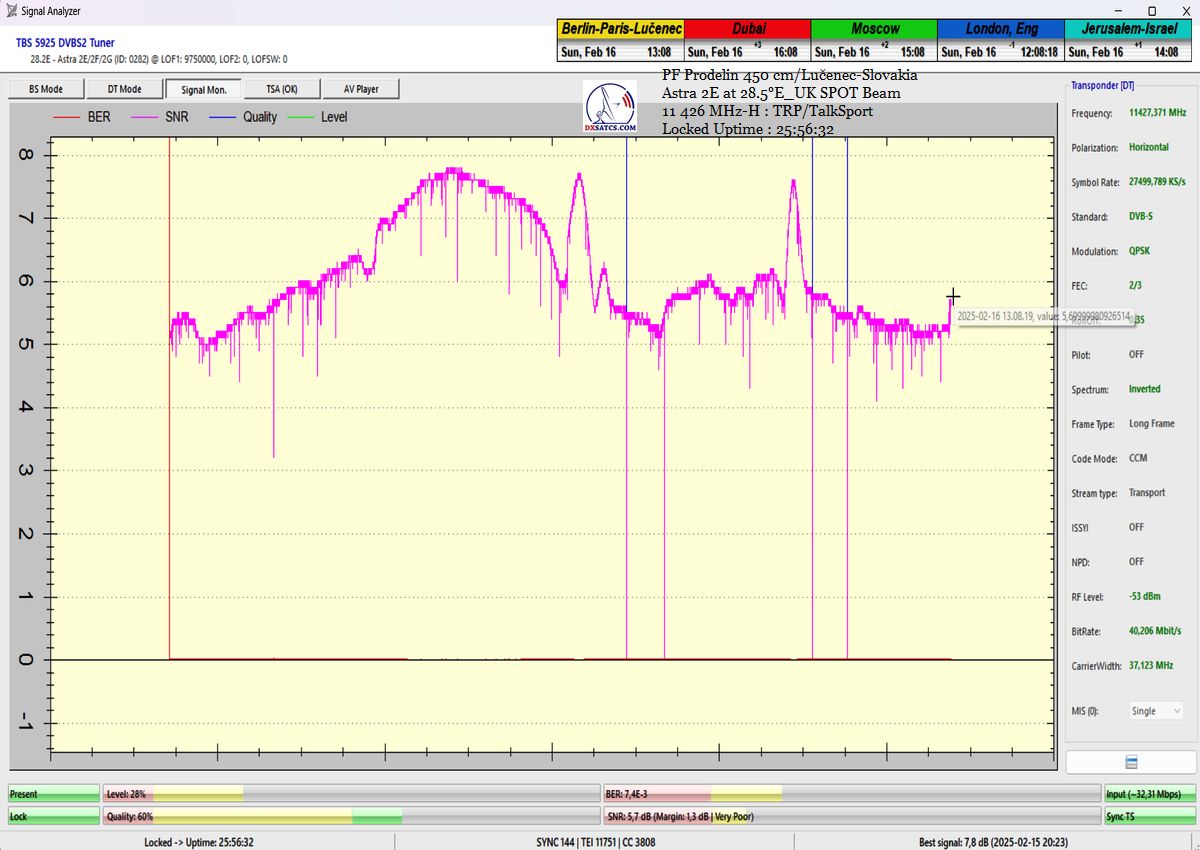 Regarding the application of my "Synchronous Nanocorrections" technology, I had to slightly adjust the signal model and timing for inserting and updating data within the antenna system for the monitored frequency f = 11,426 MHz_H from Astra 2E. I can demonstrate that, through ultra-precise replication of the signal model, I achieved a significant improvement in reception quality, exceeding even 2 dB—for instance, from SNR = 5.2 to SNR = 7.5 dB. This also verifies the accuracy and real-time validity of the data I integrate into the system. The typical validity of these data is time-limited to approximately 4–6 hours for the A2E/A2F/A2G satellite array.