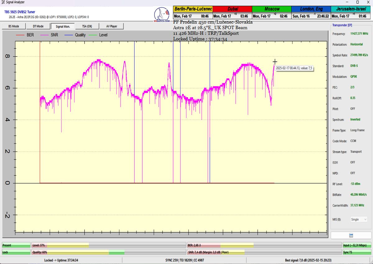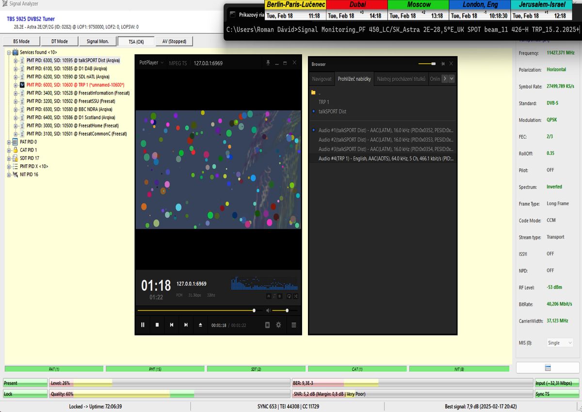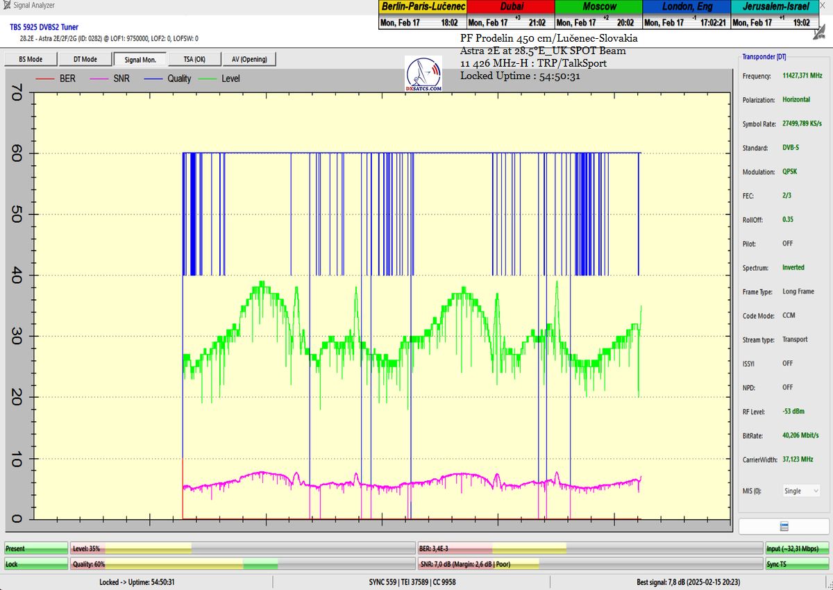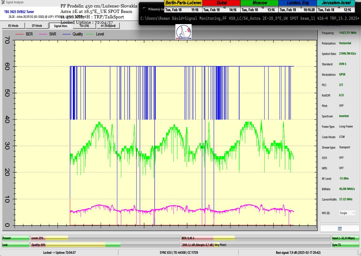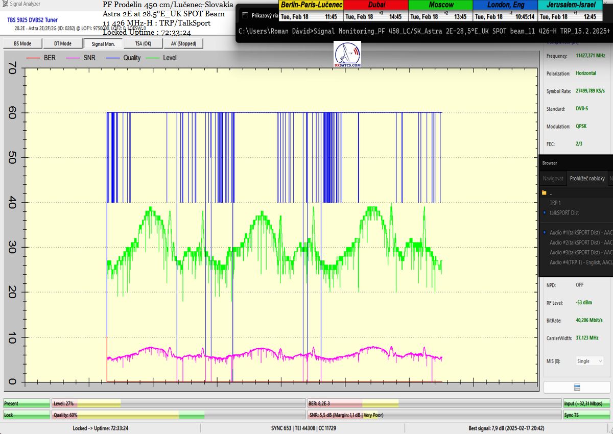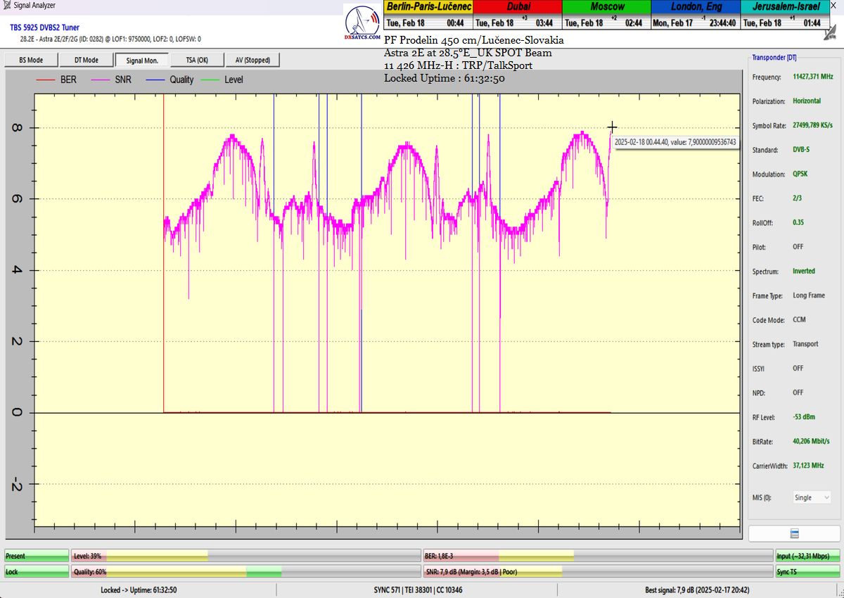 ►The comparison of the current time 9:30 on February 18, 2025, with the date and time of the last stream freeze on February 17, 2025, at 9:06:47,proves that I truly achieved a 100% reception stability within the monitoring period of t=24 hours, without a single freeze or loss of Lock.