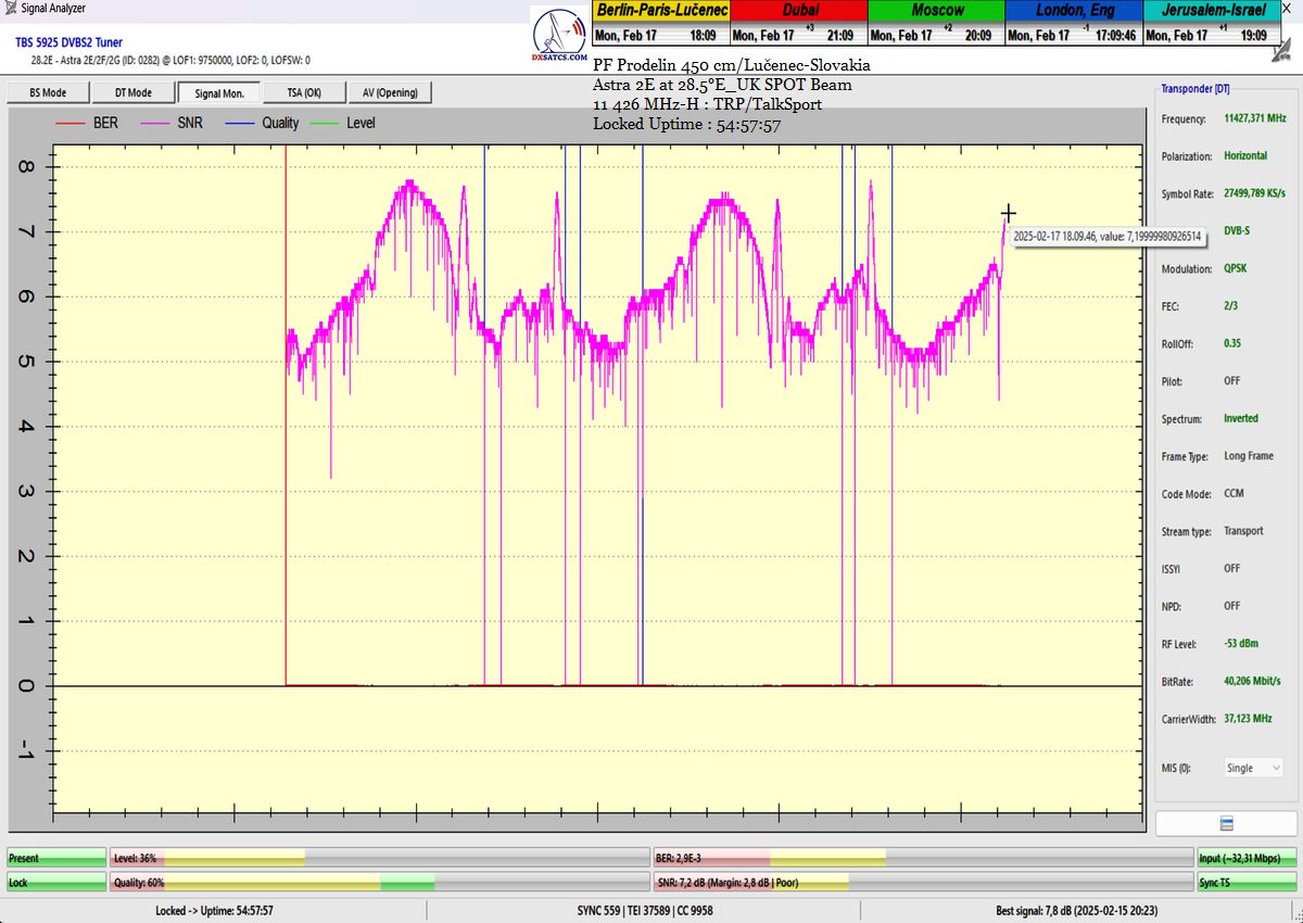 ►EN_TRP/TalkSport: Demonstrable high profit gains of over 2 dB when replicating the signal model into the antenna system using my technology "Synchronous Nanocorrection" while receiving transponder TP 115 from satellite Astra 2E at 28.5°E in the UK SPOT BEAM footprint in Lučenec in southern central Slovakia, with an output from a 450 cm dish.