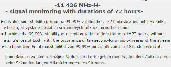 ►EN_Classification of achieved results at f=11 426 MHz_H: The results of signal monitoring over time units t=24 and t=72 hours irrefutably verify that I have achieved 100% reception stability without a single loss of lock or stream freeze in the t=24-hour monitoring unit in the city of Lučenec, located in the south of central Slovakia. In the t=72-hour monitoring unit, I achieved a reception stability of 99.99%, where out of a total of 259,200+ monitored seconds, micro-freezing of the stream occurred for only ten seconds in total. However, there was not a single loss of lock during the t=72-hour period, as the recovery from micro-freezing to lock continuity was instantaneous at every occurrence and repetition. This is further confirmed by the absence of any red areas in the signal monitoring data, which demonstrably never appeared even once over the 72-hour period.