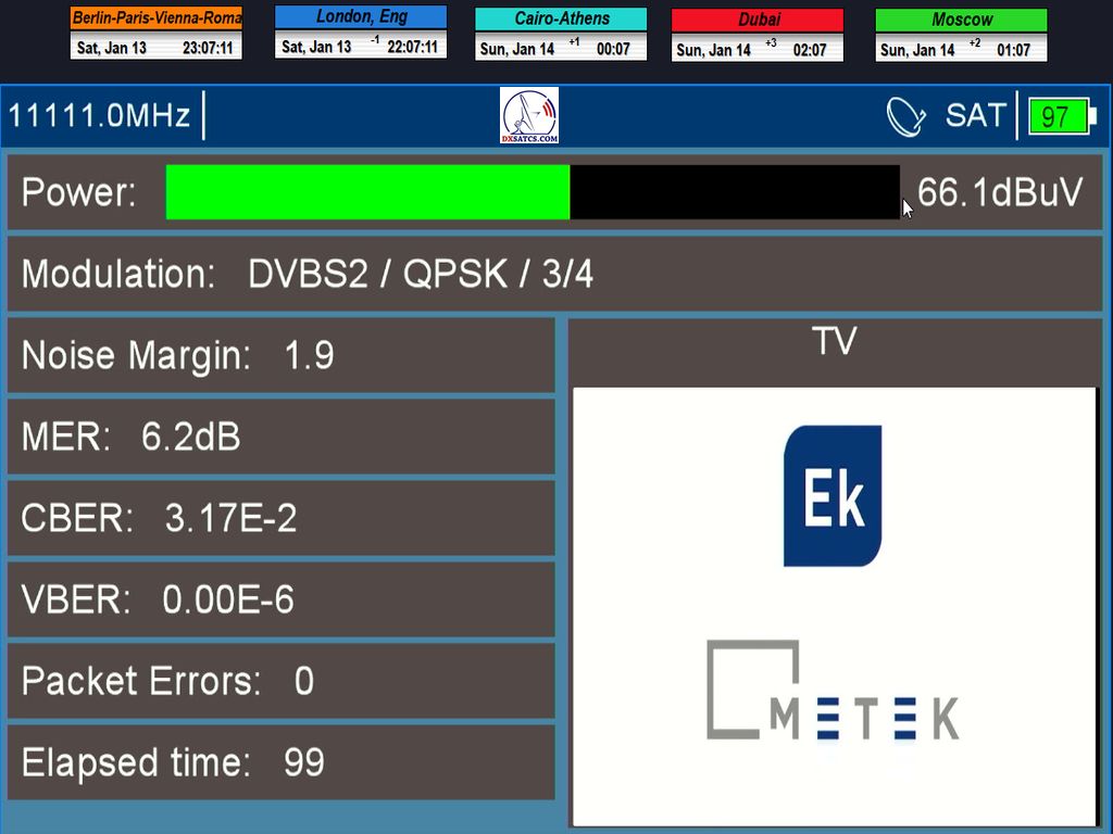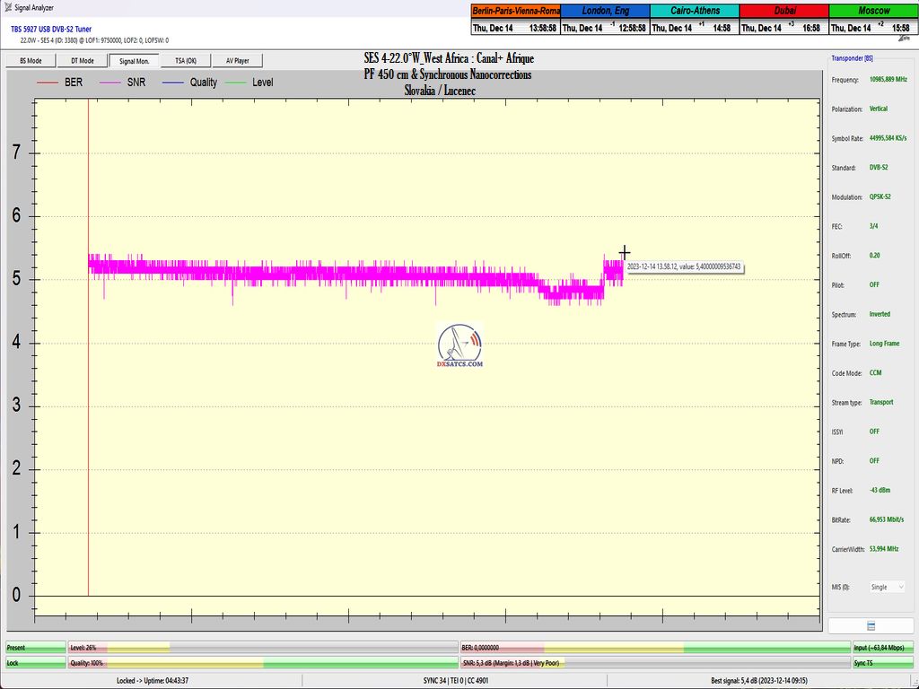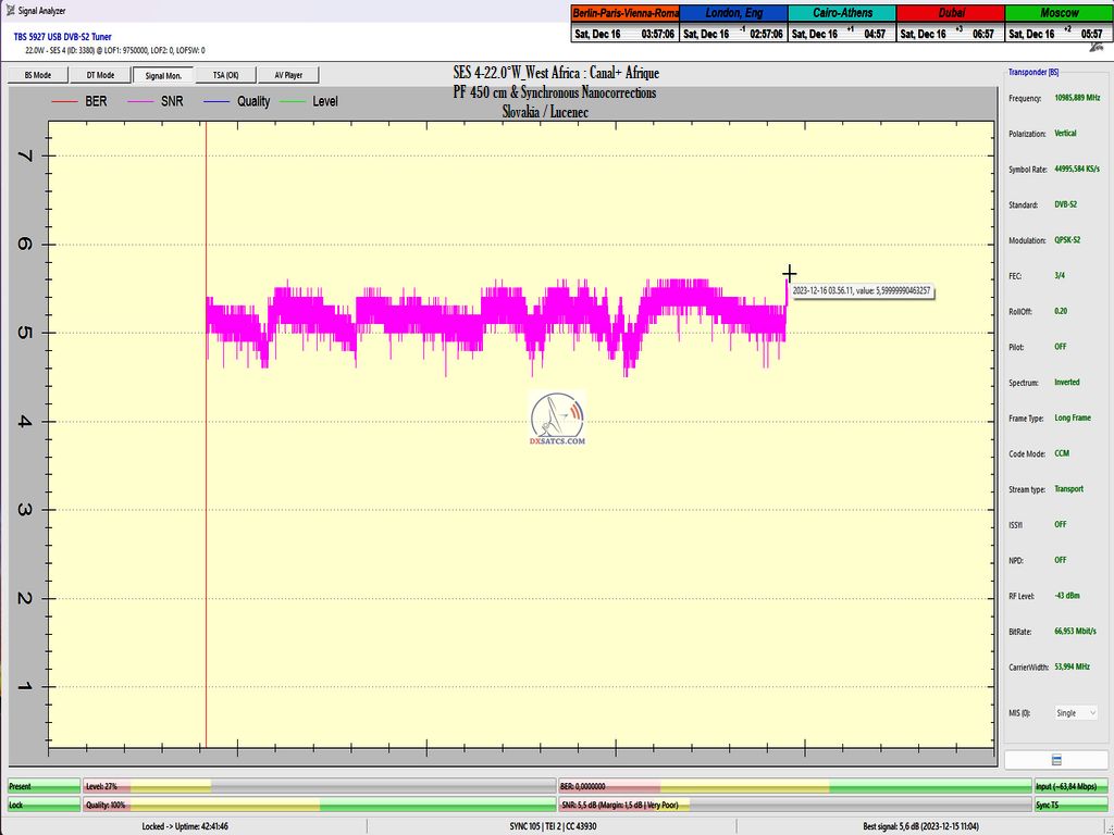 17.1.2024 :Canal+ Africa_Roman Dávid from Lučenec is the first in Europe to indisputably achieve a constant LOCK at two frequencies f=11 051+11 111 MHz.This accomplishment includes maintaining a state of consistently zero error rate BER=0.0000000 throughout the entire 72-hour monitoring verification unit, but exclusively on the frequency f=11 111 MHz. The research conducted by the author takes place in the geographical region of Central Europe with a reflector diameter (D) of 450 cm.